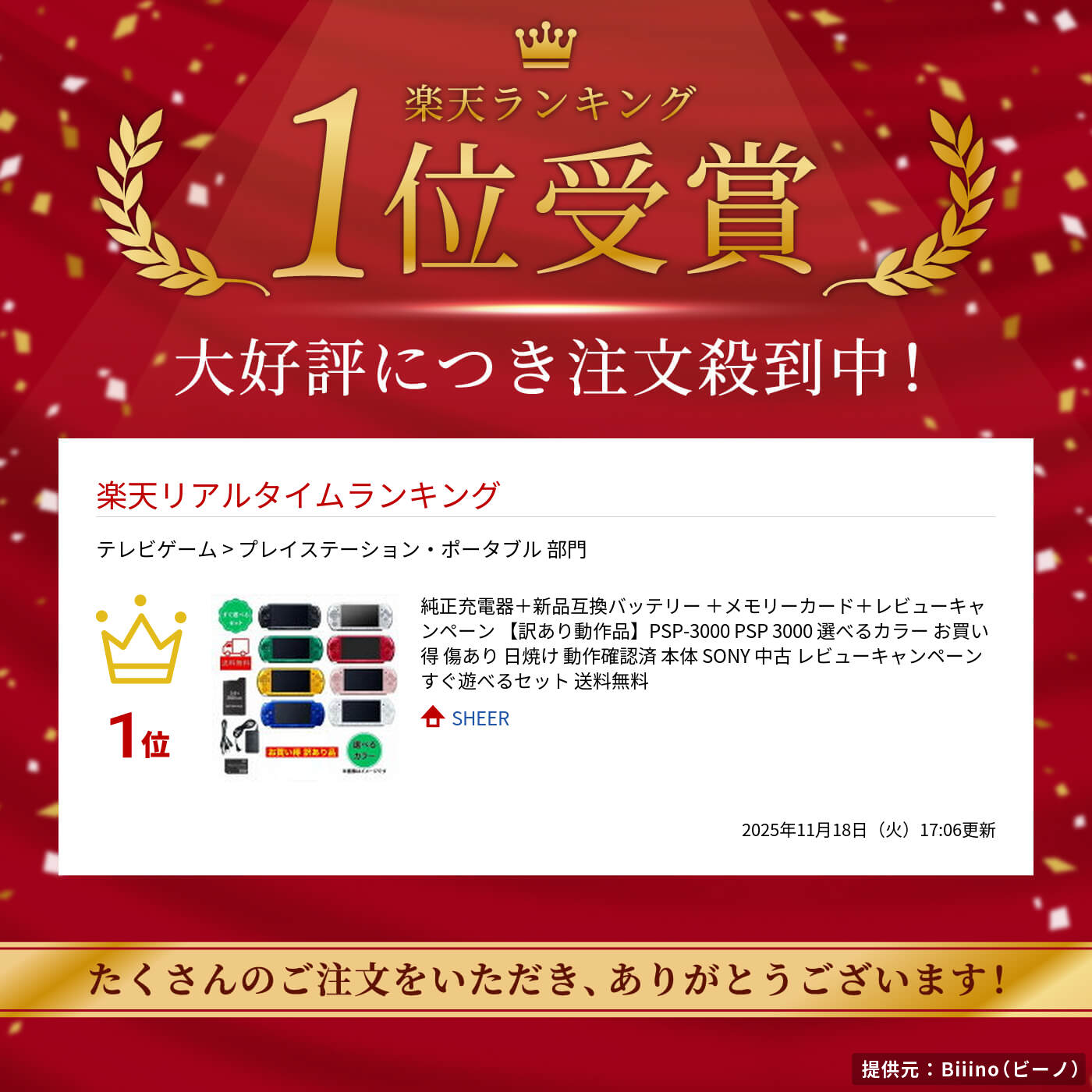 【訳あり動作品】PSP-3000本体 【すぐ遊べるセット】選べるカラ‐! ■PSP-3000 本体※カラーをお選びください ●ピアノ ブラック ●パール ホワイト ●ミスティック シルバー ●ブロッサム ピンク ●バイブラント ブルー ●ラディアント レッド ●ブライト・イエロー ●スピリティッド・グリーン ●ホワイト/ブルー ●カラーランダム 【ショップ&商品レビューを投稿することでソフト3本プレゼントキャンペーン実施中!】 ※ソフトはランダムとなります ※レビュー投稿後に注文番号をショップへご連絡ください。 ※中古ゲームソフトとなります。パッケージ・取扱説明書など付属品を欠品する場合がございます。 ※当店にて動作確認を行っておりますが、万が一動作不良等があった場合は、保証期間内にお問い合わせください。商品代金を全額返金させていただきます。 ※商品画像はイメージです。特に中古商品には個体差があり、実際とは異なる場合があります。 純正充電器+新品互換バッテリー +メモリーカード+レビューキャンペーン 【訳あり動作品】PSP-3000 PSP 3000 選べるカラー お買い得 傷あり 日焼け 動作確認済 本体 SONY 中古 レビューキャンペーン すぐ遊べるセット 送料無料 付属品セット内容:PSP3000本体、充電アダプター、メモリースティック(純正・互換・容量ランダム)、新品互換バッテリー ※本体カラーランダムの場合おまけのソフト1本(パッケージ無し)商品状態少々使用感がございます、こちらの商品は、中古商品になりますが、動作確認済みです。 出品前と発送前に動作確認(セーブデータを含む)を行い、外観、ソフトの端子部分のクリーニングを致しております。 訳あり品は外装に目立つ傷や塗装剥がれ、画面の日焼け等がある商品です、動作に問題はございません。注意事項商品画像は、サンプルになりますので、ご了承お願い致します。 関連商品純正充電器+新品互換バッテリー +レビューキャンペーン PSP-300...【すぐ遊べるセット】純正充電器+新品互換バッテリー+プレゼントキャンペ...PSP-3001 PSP 北米版 本体 プレイステーション ポータブル...16,500円9,980円14,800円PSP1000 本体 アダプター 充電器付き バッテリー付き 動作確認...おまけソフト付き【訳あり動作品】 3DS 本体 お買い得 傷あり 日焼...【すぐ遊べるセット】おまけソフト+純正充電器+SDカード付! 3DS ...8,580円14,980円15,980円★ソフトプレゼント★SCPH-90000 PS2 薄型 HDMIコンバ...Nintendo FC ニューファミコン 本体 HVC-101 コント...レビューでソフトプレゼント★ スーパーファミコンジュニア コントローラ...13,980円15,600円15,500円純正充電器+おまけソフト付! 【訳あり動作品】3DSLL 選べるカラー...ソフトプレゼント★PS2 ピンク 本体のみ (SCPH-77000P...★ソフトプレゼント★【外箱付き】PS2 本体 SCPH-70000 S...19,800円19,800円12,980円関連商品はこちらPSP1000本体のみ プレイステーションポ...【すぐ遊べるセット】純正充電器+新品...おまけ付き|PSP 2000 3000 互換 電池パ...【楽天スーパーセール★限定クーポン&全...