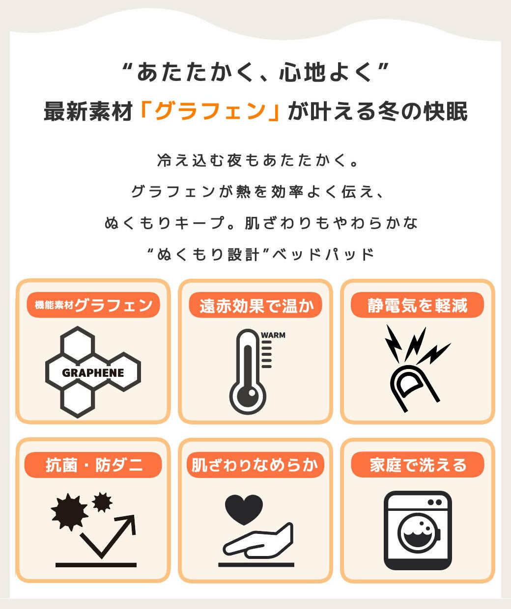 メルリー ベッドパッド グラフェン 遠赤外線 あったかベッドパッド セミシングル シングル セミダブル ダブル クイーン キング ショート ロング グラフェン フランネル ウォッシャブル 四隅ゴムバンド付 |ホワイト ブラウン グレー