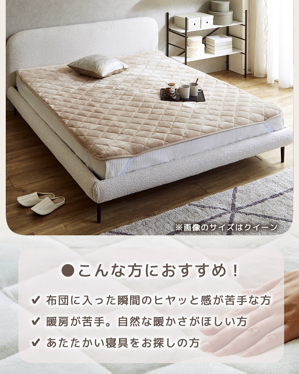 インフォメーション・注意事項 保証期間 1年 決済方法 (お買い物ガイド「お支払い方法について」をご確認ください。) 配 送 ※納期表示の異なる商品を同時に購入した場合、納期の遅い商品とまとめて発送する場合がございます。予めご了承ください。 詳細・スペック 商品説明 なめらかなフランネル生地を使用したあったかベッドパッド。熱伝導性に優れた先端素材グラフェン使用。カラダのぬくもりをパッドに伝えじんわりぽかぽか。寒い夜も遠赤効果で温かく快適な眠りをサポートします。 サイズ(約) 【セミシングルショート】幅80×奥行180cm(重量:0.76kg) 【シングルショート】幅97×奥行180cm(重量:0.92kg) 【セミシングル】幅80×奥行195cm (重量:0.82kg) 【シングル】幅97×奥行195cm (重量:0.99kg) 【セミダブル】幅120×奥行195cm (重量:1.23kg) 【ダブル】幅140×奥行195cm (重量:1.43kg) 【クイーン】160×奥行195cm (重量:1.64kg) 【キング】180×奥行195cm (重量:1.84kg) 【シングルロング】幅97×奥行210cm (重量:1.07kg) 【セミダブルロング】120×210cm (重量:1.32kg) 【ダブルロング】140×210cm (重量:1.54kg) 材 質 ■材 質: ・ポリエステル100%(グラフェン入フランネル)/ 裏生地:ポリエステル100% /詰め物:ポリエステル100% ・中綿重量【セミシングルショート】0.22kg、【シングルショート】0.26kg、【セミシングル】0.23kg、【シングル】0.28kg、【セミダブル】0.35kg、【ダブル】0.41kg、【クイーン】0.47kg、【キング】0.53kg、【シングルロング】0.31kg、【セミダブルロング】0.38kg、【ダブルロング】0.44kg 生産国中国 梱 包セミシングル:1個口:50×40×18cm、シングル:1個口:50×40×18cm、セミダブル:1個口:53×42×20cm、ダブル:1個口:55×44×22cm、クイーン:1個口:75×70×30cm、キング:59×48×26cm、セミシングルショート:45×40×17cm、シングルショート:48×40×18cm、シングルロング:50×40×18cm、セミダブルロング:50×40×18cm、ダブルロング:55×44×22cmその他・注意事項 ズレ防止四隅ゴム仕様ご家庭の洗濯機でお洗濯できます。(洗濯ネットをご使用ください。)【WH】【BR】【GY】関連商品 ▼「メルリー」シリーズ関連商品 ■ふわもこ毛布 ■ふわもこポンチョ ▼おススメ「メルリー」とコーディネート ■ファブリックベッド[リンディ]関連商品はこちら