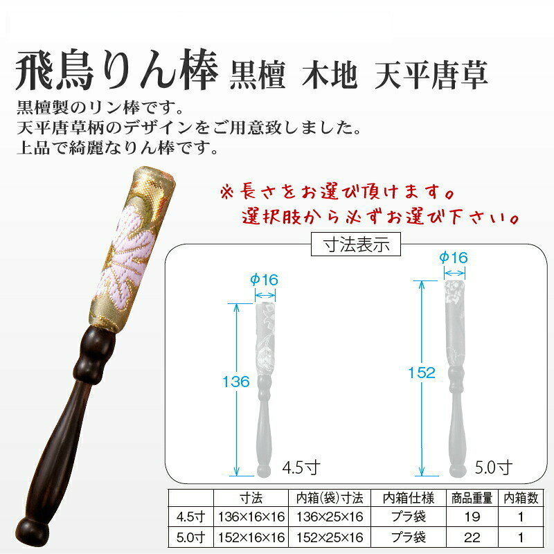 【メール便対応可】仏具 りん棒 おりん 棒 日本製 国産 [飛鳥 りん棒 黒檀 木地 天平唐草] の説明 ・黒檀製のりん棒です。 ・天平唐草柄のりん棒です。 ・上品できれいなりん棒です。 ・長さをお選び頂けます。選択肢からお選びください。 【メール便対応可】仏具 りん棒 おりん 棒 日本製 国産 [飛鳥 りん棒 黒檀 木地 天平唐草] の詳細 ・寸法(mm) 4.5寸:136×16×16 5.0寸:152×16×16 ・商品重量(g) 4.5寸:19 5.0寸:22 ・内箱数 1 ・内箱仕様 プラ袋 [本体]材料/黒檀 [生地]材料/ポリエステル・レーヨン ※こちらの商品は生地の取り位置により色柄が異なります。あらかじめご了承くださいませ。