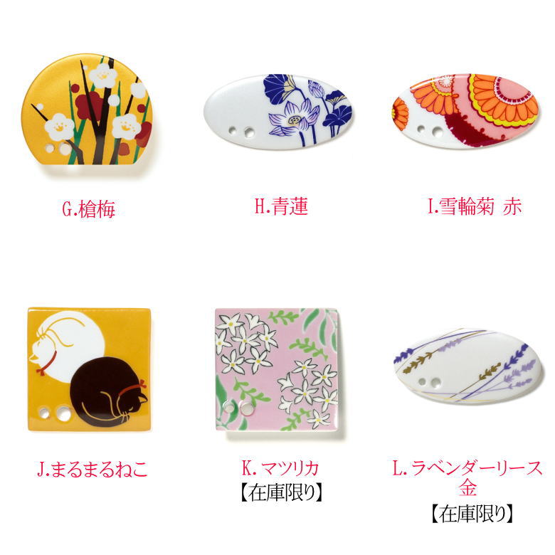 サイズ・八角・四角型お香立 2つ穴/磁器製 OP袋入 35mm×35mm×7mm ・楕円形型お香立 2つ穴/磁器製 OP袋入 28mm×55mm×6mm ・半月型お香立 2つ穴/磁器製 OP袋入 35mm×40mm×6mm ・長方形型お香立 2つ穴/磁器製 OP袋入 30mm×40mm×6mmふと気付いた香りに懐かしさを感じる...こんな体験をしたことはありませんか。 四季折々の草花の香り、水の香り、空気の香り、太陽の香り、雨の香り... いままで無意識に感じていた香りには、不思議な力があります。 あなたの心をほっとさせてくれる香りはどんな香りですか。香りはあなたの暮らしをより豊かにしてくれます。 そんな”お香”を楽しむための道具に香立があります。 気に入った物を使うのも良し、四季に合わせて使うのも良し、月々に合わせて使うのも良いですね。 たくさんの柄や形の中からその時々、季節毎、様々なシーンで、 お好きなものをお選びいただけます。 ライフスタイルに合ったお香を見つけて上手に楽しみましょう。 折々の香立 ※柄を14種類の中から選択していただけます。※数量限定商品のため在庫がなくお取り寄せの場合は商品のご用意できない場合がございます。 磁器製 ※香立ですのでお香をたかれる際は、下には灰受けとなる不燃性のお皿を敷いてご使用ください。 A.ローズガーデンパール感のある明るい黄色に、たわわに咲くバラの花。B.アイリスすっと立つアイリスの美しい姿を表現しました。C.瓦ねこ瓦屋根をお散歩する猫。日本のほのぼのとした風景を描きました。D.飛びたこ唐草たこ唐草を白い空間に泳がせました。白とブルーのシンプルなデザインです。 E.組子組子にもよく用いられる「胡麻」の文様を、あざやかな緑色の香立にあしらいました。F.菱青海波G.槍梅H.青蓮 I.雪輪菊 赤J.まるまるねこK.マツリカ優美な香りをもつ愛らしい花を、つるや葉とともにエキゾチックに描きました。L.ラベンダーリース 金風に揺れるラベンダーの花。楕円形の香立に描くことでリースのようになりました。 M.たこ唐草白地に青で隙間なく描かれた唐草の蔓(つる)。N.葉格子葉を格子状に組んだ文様です。葉っぱの金の縁取りが角度によってキラリと輝きます。