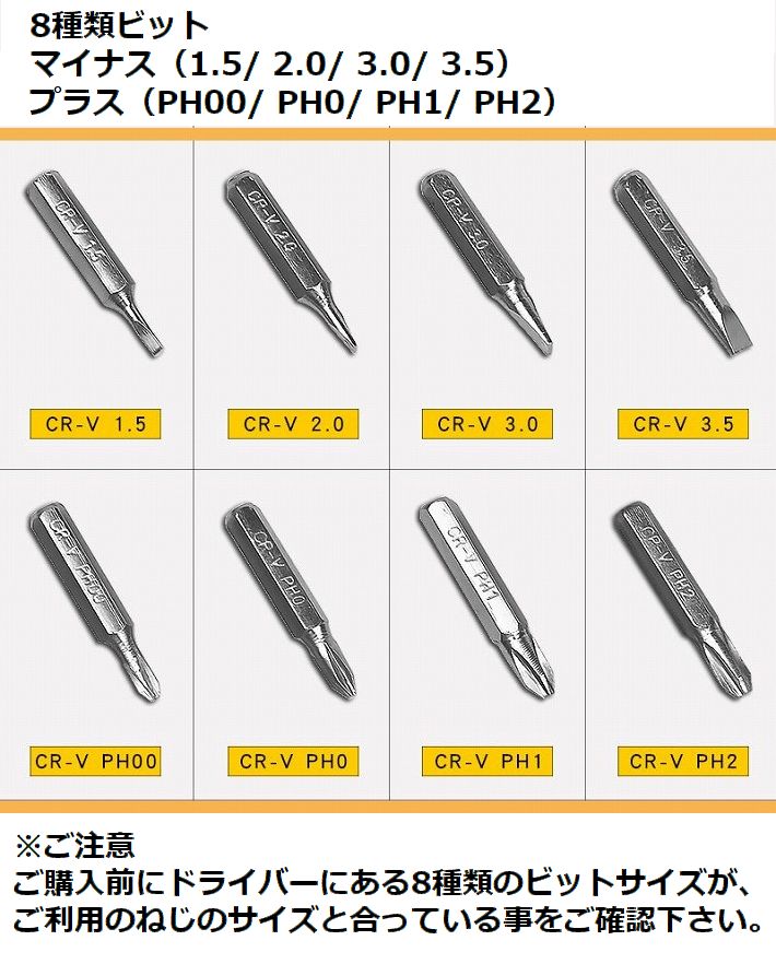 商品説明【8bits】ペン型 ドライバー 精密ドライバー ドライバーセット 工具 DIY プラス マイナス 8in1 送料無料■特徴ペンの中に各種交換ビットを格納出来ます。コンパクトサイズでポッケトにもスッポリ!いざという時に役に立ちます!幅広くご利用可能な8種類のドライバーパーツがあり、パソコン、カメラ、腕時計、メガネなどの製品に対応出来ます。■内容ペン型ドライバー本体×1ビットパーツ8個■8種類ビットマイナス(1.5/ 2.0/ 3.0/ 3.5)プラス(PH00/ PH0/ PH1/ PH2)※ご注意ご購入前にドライバーにある8種類のビットサイズが、ご利用のねじのサイズと合っている事をご確認下さい。■カラーブラックレッドシルバーネイビー ※カラーは各々のモニターにより、多少の違いがある事、ご了承下さいませ。■サイズ cm全長約11cm×幅1.5cm■素材アルミ、スチール■注意点※メーカーの製造ロット差で多少 デザインが変更になる場合があります。※海外輸入の商品になりますので多少の汚れ、傷がある場合があります。