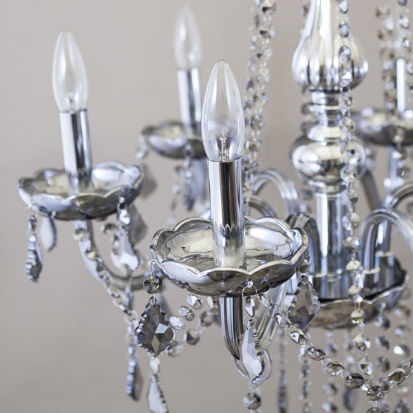 クリスタルパーツの輝きが美しいシャンデリアです。 クリスタルパーツを使用しておりますので、アクリルパーツの照明とは輝きが一段と違います。 照明を消して日光に照らされているだけでもキラキラと輝きます。 お写真からでもクリスタルの輝きは一目瞭然、うっとりするような上品な照明です。 長さ調整も簡単で、チェーンの端に開閉が出来るチェーンとなっております。 天井に取り付けてからお好みの長さに調節ができます。 電球は白熱球が付属していますので届いてからすぐに使うことができます。 E12/40W白熱電球6個付き1年間の保証書付き。 ■おすすめのLED E12口径であれば弊社のLEDは全てお使いいただけます。 水雷型が付属の白熱球と同じ見た目でオススメです。] 本 体]約 Φ 65 x H.62 cm(チェーン含まず) [重 量]約 4.4 kg [チェーン長]約100 cm(カップ含まず) <最長:約 176 cm> <最短:約 83 cm> ■素材・成分:[素 材]アイアン、クリスタルガラス [付 属]E12 40W(水雷型) 白熱電球6個付き (最大40Wまで対応)