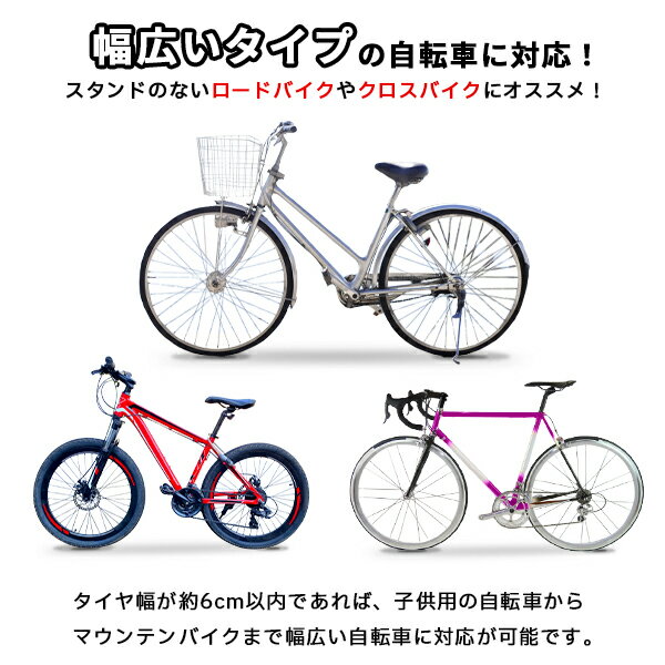 商品内容:自転車スタンド×1(組み立て式) サイズ:横幅約36cm×奥行約40cm×高さ約78cm 製造国:中国 ■タイヤを乗せるだけで簡単駐輪 タイヤを乗せるだけで簡単に安定した駐輪ができます。 ■狭小スペース設計 軽量でコンパクトな設計になっている為、 狭いスペースでも駐輪ができます。 また外出先への持ち運びも可能になります。 ■幅広いタイプの自転車に対応 タイヤ幅が約6cm以内であれば、 子供用の自転車からマウンテンバイクまで 幅広い自転車に対応が可能です。 ※注意事項※ ・屋内ではキズ防止にマットを敷いてご使用ください。 ・改造、本来の目的以外の無理のある使用はお控えください。 ・ディスプレイ画面等の環境上、写真と実際の商品の色とは異なる場合がございます。 ・海外輸入商品により、汚れ、ダメージ等がついている場合がございます。 以上ご同意の上、ご検討の程よろしくお願い申し上げます。