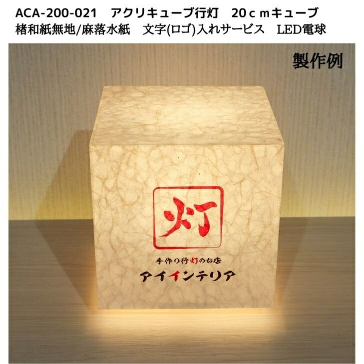 ACA200-021-1 アクリキューブ行灯 20cmキューブ楮和紙無地/麻落水紙 1面文字(ロゴ)入れサービス LED電球ホテル・和風旅館・飲食店・リラクゼーション施設などにお薦め!オリジナル行灯をリーズナブルに製作致します。 【送料無料】☆手作り行灯・行灯・行燈・和風 照明 LED・フロアスタンド 和風・ルームライト 和風・モダン ・ 和モダン☆ オリジナルキューブ行灯製作サービス。1面文字入れサービス用です。 ☆☆☆商品スペック☆☆☆■サイズH220mm×W200mm×D200mm ■中間スイッチ付コード1.5m ■LED電球 4.5W(35W相当)(E-17)電球色★電球寿命約30,000時間以上(メーカー値) ■本体行灯枠:アクリル3mm厚使用■和紙:楮和紙(無地未晒し)/麻落水紙(未晒し)■印刷面:1面(正面)☆全国送料無料商品☆☆☆商品説明☆☆☆◆アクリル材をベースにシンプルなキューブ型に仕上げました。◆フレーム全てをアクリル材で作ることで、灯りを点けた時に宙に浮いているように見える演出。★行灯面印刷できる寸法:タテ約20cm×ヨコ20cmです。(余白なども考慮してデータを製作して下さい)★データ入稿:.AI(最新版まで対応)又は、PDFや.JPGデータ(高解像度)をメールで送って頂ければ対応できます。AIデータの場合、雛形有り。※.jpgデータの場合は、弊社にてレイアウト作成致します。※和紙に印刷しますので写真などは不向きです。ご了承ください。添付ファイルの送り先 i-in@tiara.ocn.ne.jp へお願い致します。 ●ご注文内容が決まっている方は、ご注文確定後に詳細を打ち合わせ致します。 和紙を通した、暖かな癒しの灯り! オリジナル行灯、簡単製作! イベント・お店のアクセントとして! ホテル・旅館や飲食店の、通路や部屋入口の案内用に! おすすめメニュー(商品)の表示サインとして! 洋風の場所へ、和のテイストとして! こんにちは!店長の石橋です。当店の行灯は、和紙を通した灯りの暖かさを手作りで製作してお届けします。お祝い・贈り物としてもおすすめです。【送料無料】手作り行灯 ☆行灯・行燈 ・和風 照明 LED対応・フロアスタンド 和風・ 和モダン ☆ 1