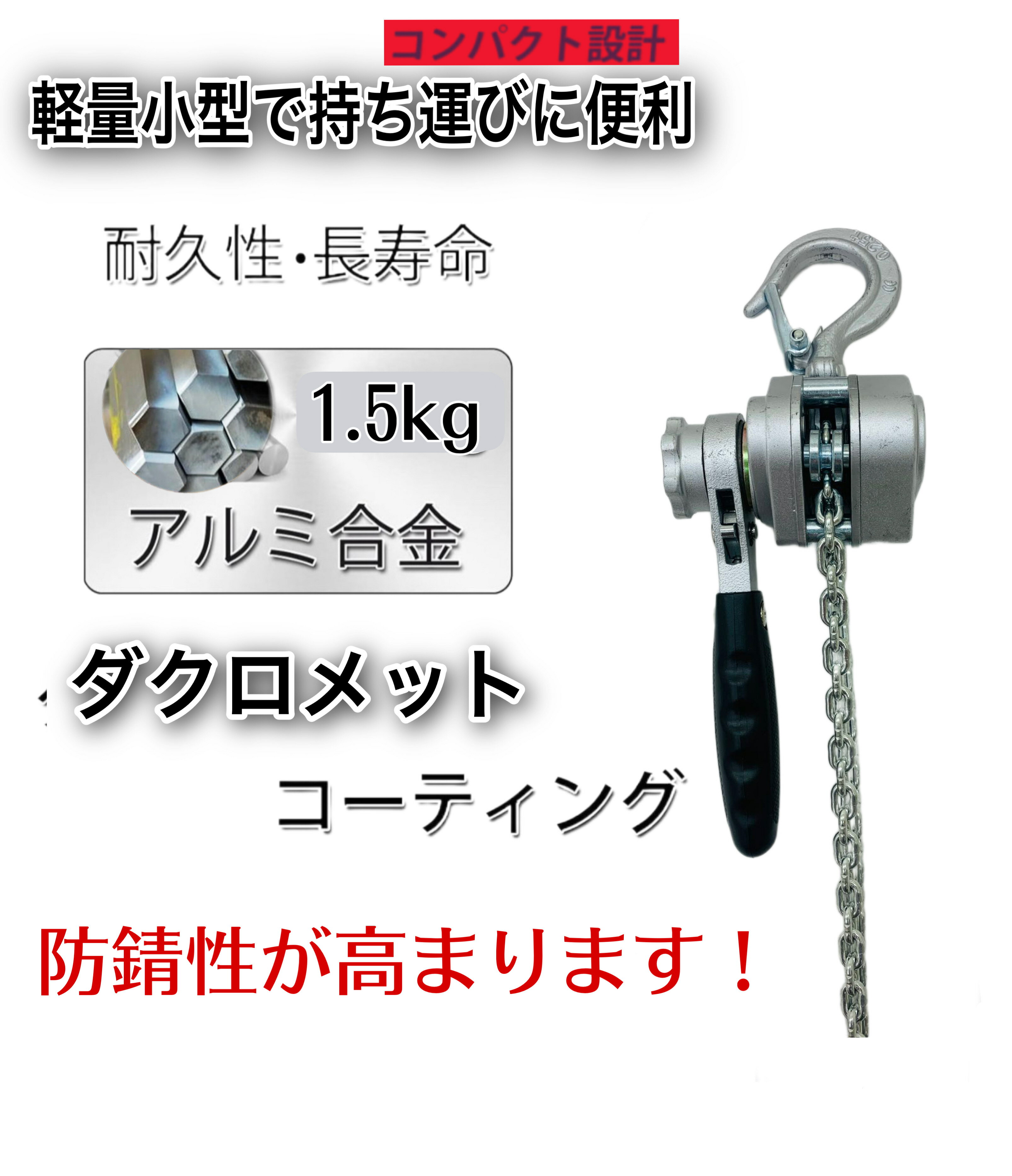 1.5kg 軽量化 小型化 アルミ合金鋼製のチェーンホイスト荷締め機です。 表面処理:ダクロメット 強靭さだけでなく、耐食性、耐摩耗性も併せ持っています。 合金鋼材質G80で作られたチェーンを採用し、耐久力の強いレバーホイストです。 【コンパクト】軽量タイプのアルミ製ボディーや、サビに強いアルミ製ボディーのものがあります。ディスクブレーキ式クラッチ採用で緩めの時でも安全に作業できます。 無負荷時に切り替えレバーを中央の位置(N)にするだけで自動空転になり、作業に合わせた揚程に素早く調整できます。 ●超小形、軽量のため、持ち運びはもちろん、狭い場所や高所での作業にも便利です。 品質改良を重ね、以前のレバーホイストより性能がアップ! 1.0tonタイプでは大きすぎる、重すぎる…という方にはこの小型軽量0.75ton 0.5ton 0.25tonタイプがオススメです。 1.0tonタイプと比べてひと回り小型でかつ軽量なので、使い勝手がよく作業効率も向上。> 【仕様】 ●定格荷重:0.25ton ●揚程:1m ●手動力:190N ●レバー長さ:140mm ●フック開口寸法:21mm ●上下フック間最小寸法:200mm ●チェーン掛数:1本 ●生産物賠償責任保険 PL保険加入商品です。 【用途】 重量物の緊縛輸送、鉄骨の歪み取り、大型機械の引き寄せ、建築物の芯だし作業に最適。 自動車板金のフレーム修正、山林業果樹園の原木搬出・抜根・杭抜作業などにもお勧めです。 ※商品改良の為、仕様・外観は予告なく変更する場合があります。 ※輸入商品に付き、多少のキズ汚れなどがある場合がございます。保証期間:1年 (※保証書付。必ず無くさないように保管して下さい 紛失した場合、保証ができかねますのでご了承ください) 使用状況によっては保証対象外となる場合がございますので返送前に必ずお問い合わせください 保証期間内の返送運賃はお客様負担でお願いいたします お客様によるイメージ違いでの返品は一切お受け出来ませんので予めご注意くださいご注意(免責)> 必ずお読み下さい 【安全上のご注意】 1、手動力は、定格巻上げ時、作業者の手動力に負担を掛け過ぎない適切な値としています。 2、実作業は定格荷重内で余裕をもって行ってください。 3、作業前、変形や傷はないか動きはスムーズか確認し、点検で問題のある製品は使用してはいけません。 4、切り替えツマミの位置は、作業方向と一致しているか常に確認しながら作業を行ってください。 5、巻き上下の作業中は、ユーテンニギリに触れてはいけません。 6、巻き下げ操作でロードチェーンが戻らない場合は、荷重がかかり過ぎている事が考えられます。切り替えツマミをDに切り替え反時計回りに力いっぱい回すと解除できます。取り外し後は十分な点検と定格荷重を確認してください。 7、メカニカルブレーキのブレーキパンには油を付けないでください。 8、雨が直接かかるなど、錆の元になるような場所で保管しないでください。 9、注意事項を守らず、誤った使用上の事故や損害について、当社は一切の責任を負いません。▼検索キーワード レバーホイスト チェーンホイスト チェーンブロック レバー式ブロック 荷締機 ガッチャ がっちゃ 手動式 荷締め 運搬 固定 建設 業務 巻き上げ 巻き下げ ウィンチ 災害 復旧 レバー ホイスト ジャッキ チェーン ガッチャ 荷締め機 運送 建築 土木 農林業 工具 工場向け 作業 屋内 屋外 敬老の日 母の日 父の日 ギフト 誕生日 プレゼント 父の日ギフト 誕生日プレゼント 結婚祝い 福袋 メンズ レディース 男性 女性 あす楽 人気 おすすめ 送料無料