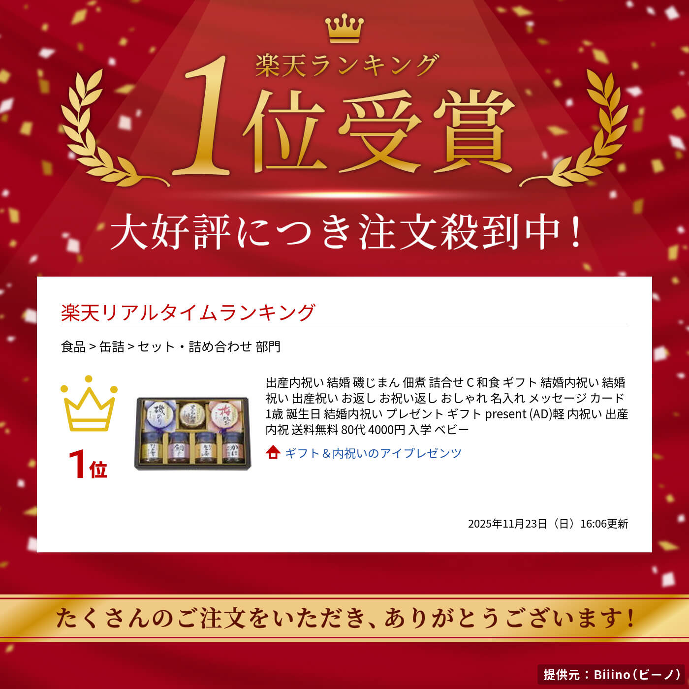 迷ったら?まずはギフト診断!▼ ●こちらの商品は【宅配商品】のため、デジタルメッセージには対応しておりません。 SNSですぐに贈れる【e-Gift】はこちらからどうぞ>>> ●お届け日が「仏滅」にあたる場合がございます。「仏滅」を避けてお届けをご希望の場合には、お届け日をご指定いただくか、備考欄へご指示をお願いいたします。 ●お熨斗は「ご自宅届け」「複数ご注文」「仏事利用」の場合は【外熨斗】でお届けしております。 上記のご用途で【内熨斗】をご希望の場合は、備考欄にてご指示をお願いいたします。 商品によっては【内熨斗】のご指定ができないものもございます。予めご了承ください。 ●当店では請求書や納品書など、金額の分かる伝票はお品物に同梱しておりません。何卒ご安心下さい。 ●お届け先ご住所の入力間違いや、お届け先様長期ご不在等の理由で、お品物をお届けできず、運送会社での保管期間を過ぎた場合は、お品物はご注文者様へ自動転送となります。 ●宛先不明などにより商品を転送する場合、別途送料が発生いたします。 ギフト対応について 【商品詳細】四季折々の海の幸、山の幸を風味豊かな佃煮にしました。大正15年創業以来、大切に守り続ける伝承と伝統の味です。[商品内容]磯のり・梅かつお・黒毛和牛肉みそ 各90g×1、柚子風味なめ茸85g、刻み生姜煮90g、鯛みそ100g、かにのり佃煮90g●箱サイズ(cm):19.5×29×7[宅配時の状態]常温[賞味期間]540日[7大アレルゲン]小麦、大豆 【配送について】 運送会社による破損や紛失につきましては、当店が無料で商品を再手配いたします。 配達指定をされていても、交通事情や、天災などによりご指定の通りお届けできないことが稀にございます。 【熨斗(のし)対応について】 のし(掛け紙)のご不明点やご相談がございましたら、ご遠慮なくお問合せください。当店が責任を持って対応いたします。 【配送伝票の依頼主について】配送伝票の依頼主は、ご注文者様情報を印字しております。ご変更指示は、メールまたはお電話にてお申し付け下さい。 【携帯メール受信設定をお願いいたします。】 お客様のメール受信設定により、当店のご案内をお届けできないことがございます。 当店のメールを受信できるようご設定をお願いいたします。 【送付先間違いにご注意下さい!】 送付先変更をされたつもりでも、変更されていないことがございます。 ご注文後、当店よりお送りする注文確認メールの送付先を必ずご確認下さい。 【領収書・お買い物明細書の発行について】 ・ギフト商品のため金額の分る書類の同梱は通常しておりません。 ・発行を希望されるお客様は、メールまたはお電話にてお申し付け下さい。データをメールでお送りさせていただきます。 ・印刷が必要なお客様は、送付手数料100円(税別)を商品代金にプラスさせて頂きます。 ●こちらの商品には、運賃、メッセージカード、のし、ラッピング、梱包資材、運送事故紛失補償などが含まれたパッケージ価格となっております。 ●ご注文のタイミングにより、注文確定後に在庫切れとなる場合がございます。予めご了承下さい。 ●商品リニューアルに伴いパッケージの改訂に加え内容量等の変更が生じる場合がございます。【限定配布中!】▼お得なクーポンはこちらから▼ ◆お祝いに人気の商品を取り揃えております。 結婚 出産 お礼 お祝い お返し 退職祝い 定年 贈り物 母親 おばあちゃん 父 両親 女性 男性 友達 人気 オシャレ 花 お菓子 スイーツ 食べ物 30代 40代 50代 60代 70代 古希祝い 喜寿祝い 傘寿祝い 米寿祝い 本州 送料無料 オシャレ 入学祝 入学祝い 入学内祝い 入学 ランキング 入学祝い返し 祝い 初節句