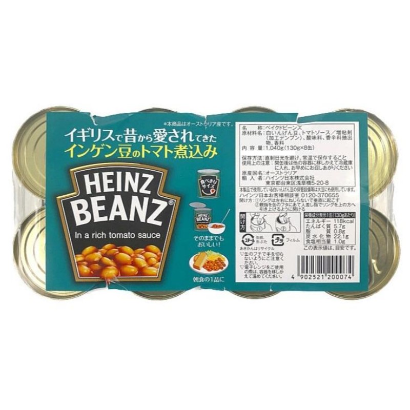 濃厚なトマトソースで煮込んだ白インゲン豆【人工香料・着色料・保存料不使用】 ハインツ ベイクドビーンズは、風味豊かなトマトソースで調理した豆料理です。 イギリスを代表する朝食メニューとして有名です。 既に加熱調理済みなので、開缶後、そのまますぐに食べられます。 また、鍋や電子レンジで温めるとさらに美味しくなります。 高たんぱくで低脂肪、食物繊維も豊富で栄養満点。 人工香料、着色料、保存料は一切含みません。 世界各地で長年愛され、イギリスとオーストラリアでは売上げNo1を誇る朝食メニューのアイコン的存在のビーンズです。 缶を開けてそのままの状態でベーコンやハムの付け合わせとして、またシチューや煮込み料理などでもお使いいただけます。 名 称:ベイクドビーンズ 原材料名:白いんげん豆、トマトソース/増粘剤 (加工デンプン)、酸味料、香辛料抽出物、香料 内容量:1040g(130g×8缶) 原産国:オーストラリア 輸入者:ハインツ日本株式会社 ※本製品で使用している白いんげん豆の保管設備は大豆にも使用しています。