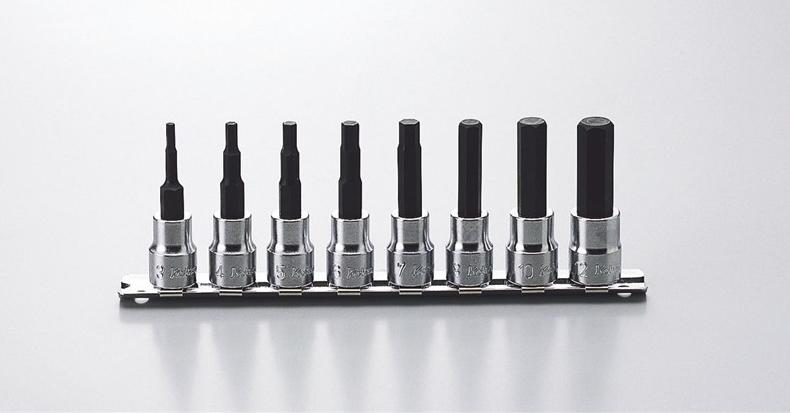 高いねじり強度、耐磨耗性と耐久性を備える、Ko-ken(コーケン)山下工業研究所製(日本製)のビットソケットセットです。六角穴付ボルト・止めねじの着脱用。7mm以下の小さなサイズは、六角部の根元を太くして剛性を高めています。また丸穴ではなく六角穴に圧入して耐久性を高めています。標準的な使いやすい長さ全長 62mm3 4 5 6 7 8 10 12ミリ8サイズすべてが全長62mmに統一されています。7mm以下のタイプは、六角部の根元を太くして応力を分散させている。丸穴ではなく六角穴に圧入してあり、モノづくに対する真摯な姿勢がある製品です。 ご購入いただいたお客さまの評価評価:◎コメント:価格の割りにかなりの出来栄えだと思います。スタビレーの手持ちが若干短めなので重宝しています。違います。レビューを見る・六角穴付ボルト、キャップボルトを締め付けたり緩めたりするためのヘックスビットソケットです。・ロングタイプは奥まった場所にある六角穴付ボルトにも対応できます。またショートタイプは、スペースのない箇所にも対応できます。標準は62mmになりますが、種類が豊富ですので、用途に合った全長をお選びいただけます。・小さなサイズは先端が見やすいように、根元より先端が細くなっています。・根元が六角形状の圧入タイプですので、根元がガタつきにくく、過酷な現場でも長くお使いいただけます。3010M (標準サイズ=L62) 3015M D(mm)L=62 (mm)L=38 (mm)L=100 (mm)L=160 (mm)L=62 (mm)L=100 (mm)333333184444441855555518666666187777771888888818101010101010201212121212122013131313(グリップリング付)221414141422レールセットRS3010M/8-L62・・・3-4-5-6-7-8-10-12ミリRS3010M/8-L38・・・3-4-5-6-7-8-10-12ミリRS3010M/8-L100・・・3-4-5-6-7-8-10-12ミリ(グリップリング付)RS3015M/8-L62・・・3-4-5-6-7-8-10-12ミリRS3015M/8-L100・・・3-4-5-6-7-8-10-12ミリコーケンブランド 株式会社山下工業研究所(山下工研 YAMA-SHITA KoKen)製品 ソケットレンチは「MADE IN JAPAN」と刻印し、100%日本製であることを表示しています。カテゴリー;DIY作業工具ハンドツール