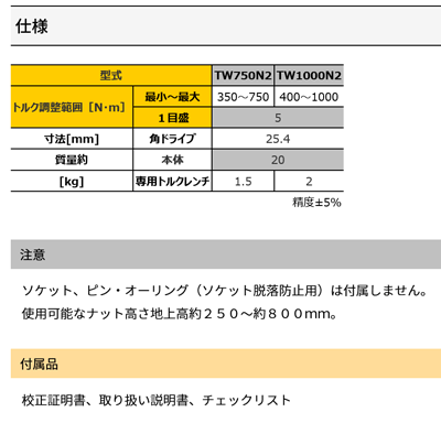 TW2は2機種ともに公益社団法人全日本トラック協会(全ト協)による【安全装置等導入促進助成事業】での助成金対象製品です。機器関連の必要書類(税抜き取得金額明記の請求書・領収書・最大締付トルク記載の製品パンフレット)をご用意させていただきます。- 山梨 Made in Japan -10万回または1年の耐久精度保障大型車のホイールナット締め付けが『一人で・楽に・正確に・安価で』できるトルクレンチ。トルク調整範囲 400-1000N.m 1目盛り5N.m角ドライブ 25.4mm(1")ピン穴付(インパクト用ソケットを使います)【一人で】キャスター付きの自立型、エアホース/コード不要で移動もラクラク。【楽に】約3倍の増力装置内蔵で、700Nmの締付けも「片手でカッチン」。【正確に】精度±5%、校正証明書付き。・TW1000Nは自立型ですので、従来の大型トルクレンチでの「トルクレンチ先端を持つ人」と「締める人」と言った、二人がかりの作業が『一人』で行えます。・約3倍の増力機構を内蔵し、小さな力で『楽に』大型車のホイールナットのトルク管理が可能です。・TW1000Nは、ダンパーにより昇降操作がワンタッチで『楽に』行えます。またユニークなキャスターレイアウトにより、自由自在に締め付けるべきナットへアクセスできます。・トルク制御可能な動力式締め付け機より大幅に安価で省力化可能です。・動力源(エア・電気)不要。広い工場内の移動や外出先でも手軽にお使いいただけます。インパクト用ソケット(角ドライブ=25.4mm(1") )は、別売になります。・地上高 約255〜約790mmのナットに対応できます。・精度±5%、正逆ねじ対応、校正証明書付属、PAT.PENDインパクト用ソケット、ピン・Oリング(ソケット止め)は別売 重量物につき、東日製作所より発送させていただきます。佐川急便の配送不可地域へ発送はキャンセル扱いになります。カテゴリー測定工具》トルク機器/ハンドツールTOHNICHI 株式会社東日製作所※付属の校正証明書QRコードより「トレーサビリティ体系図」を無償でダウンロード可能