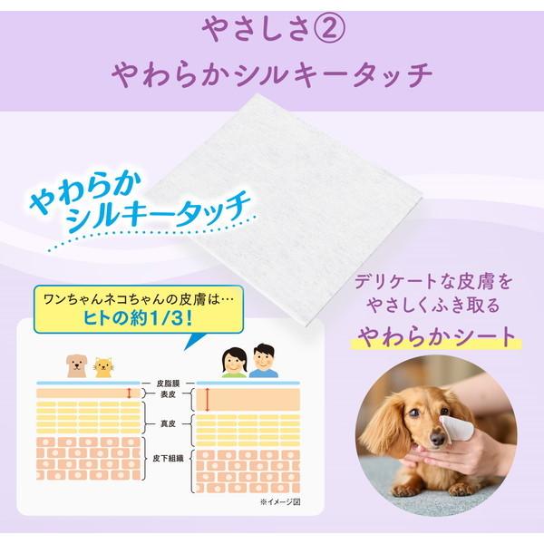 商品説明(製品の特徴) ●デリケートな皮膚をやさしくふき取る、やわらかシート。シルキータッチシートを採用。 ●なめても安心!ワンちゃんネコちゃんの肌を考えた専用の薬液処方。 ●散歩の後、食事の後、目やにケアなどこれ1つで全身をお手入れ出来ます。 ●水分たっぷりで、こすらずサッと拭きとれます。やさしく触れて肌への負担が少ないです。 内容量 60枚×3パック サイズ ?幅153×奥行100×高さ119mm 素材 レーヨン、PET 成分 水、防腐剤 ご使用上の注意 ・本品は犬猫用品です。目的以外の用途では使用しないでください。 ・トイレの詰まりを防止するために、水洗トイレに流さないでください。 ・お肌に合わない場合は、使用を中止してください。 ・目や耳のまわりに使用する場合は、水分が入らないよう、しぼってから使用してください。 ・目や口などの粘膜、傷や湿疹のある皮膚には使用しないでください。 ・中身の乾燥を防ぐため、ご使用後は必ずシールをきちんと閉めてください。 ・乳幼児やペットが触れない所に保管してください。 ・本品は食べられません。万が一飲み込んだ場合は、医師や獣医師にご相談ください。 ・シートは長時間置いておくと乾燥しはじめるため、一度袋から出したらすぐに使用してください。 ・火気の近く、日の当たる所及び高温になる所には置かないでください。 問合せ先 株式会社スリーアローズ 〒140-0002 東京都品川区東品川2-3-14 東京フロントテラス8階 0120-883-680 製造販売会社(メーカー) 大王製紙株式会社 生産国 日本