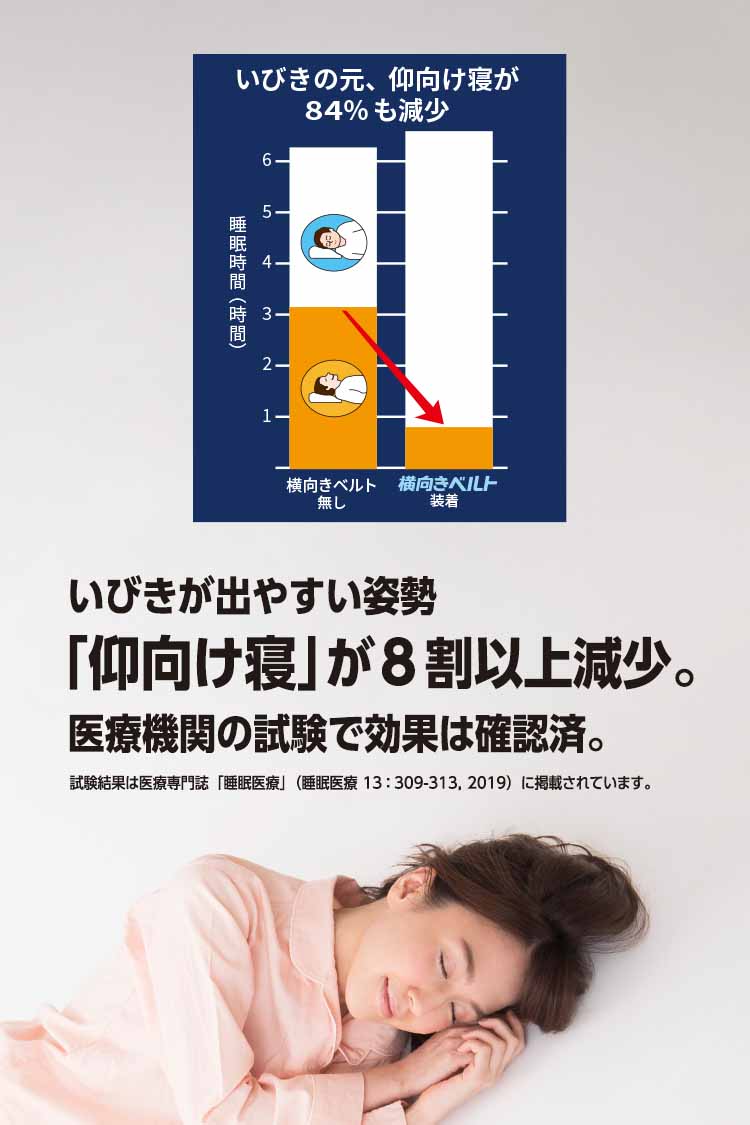 いびきが起こりやすい"仰向け寝"が84%減少しました。横向きベルトRT-1の効果はヒト試験で実証済みです! 横向きベルトの着用により仰向けで寝る時間が大幅に減少し、横向きで寝る時間が増加しました。 横向きベルトなし 横向きベルトを着用 仰向け寝の時間 3時間22分 31分 横向き寝の時間 2時間42分 5時間58分 睡眠時間(合計) 6時間4分 6時間29分 ベルト着用により横向き寝の時間が長くなったほか、睡眠時間が25分延びています。睡眠の質の改善が期待できます。 動脈血の酸素濃度低下の緩和 いびきが大きい人はのどが狭くなって呼吸がスムーズではなく、血中の酸素濃度が低下する傾向があります。 血中の酸素の濃度の低下度は、1時間あたりに酸素濃度が3%以上低くなる回数で調べます。 酸素濃度が低下した回数 横向きベルトなし 13.6回/1時間あたり 横向きベルト着用 7.0回/1時間あたり 有意差 p<0.003 データによると、低下する回数は横向きベルト着用により有意に減りました。 この結果は、酸素濃度に良い影響を及ぼしていることを示唆しています。 ※有意差とは 統計学上、意味のある差であることを示す数字。pで表します。 pが0.05より小さい場合には「有意差がある」と言います。 数字が小さいほど精度が高い試験とされ、今回の試験結果はp<0.003、極めて精度の高い試験です。 この試験結果の論文は、 いびき対策商品としては珍しい「査読付き論文」です。 論文の掲載前に「睡眠医療」の分野の専門家が厳しくチェック(査読)し、合格した信頼性の高い論文です。 ■比較試験実施機関 駒ヶ嶺医院睡眠呼吸センター(東京都新宿区) ■論文掲載誌 睡眠医療 13:309-313,2019. 東京天使病院 髙﨑雄司先生のご意見 長年、いびきや無呼吸について研究・診療してきた立場から、横向きベルトを用いたいびき対策は理にかなっていると考えます 髙﨑雄司先生 呼吸器内科専門医・睡眠医療認定医、日本医科大学卒、東海大学教授、日本医科大学助教授、駒ヶ嶺睡眠呼吸センター長などを歴任 いびきは鼻ではなく、のどの奥から出る! 仰向けで寝ると大きくなってしまう、 いびきのメカニズム 仰向きで寝ると、舌の奥(舌根)が落ち込み、喉が狭くなります。 狭くなった喉で無理に呼吸すると粘膜が振動して大きな音が出ます。これが「いびき」です。 舌の落ち込みがさらにひどく、喉が塞がってしまうのが「無呼吸」の状態です。 いびき、さらに進んだ無呼吸の状態は睡眠の質を落とします。睡眠は体が回復する時間です。このため大きないびきや無呼吸は、健康に悪影響をもたらすと言われています。 どうすれば防ぐことができるのか。その答えは、 横向き寝になれば いびきは静かになる 横向き寝でいびきが静まるのは、舌根が空気の通り道を塞がないから。横向き寝ではいびきや無呼吸が起こりにくくなります。 いびきの大きい「仰向け寝」を減らし横向き寝にする 横向きベルトRT-1のしくみ 横向きベルトをおへその位置に巻き、スイッチを入れて就寝するだけ。 仰向け寝になるとベルト中央の体位センサーが感知し、バイブレーターがやさしく振動。目覚めない程度の刺激で、自然に横向き寝になるように促します。姿勢が横向き寝になるとバイブレーターが停止します。 横向きベルトはいびきの出やすい姿勢を減らし、睡眠の質の改善が期待できます。 新しいいびき対策のポイントは「寝返り」 横向きベルトRT-1のもう一つの利点、それは、自由に「寝返りが出来る」ことです。 いびき対策なら横向き寝のまま体を固定すればいいのでは?と考える方もいるでしょう。 しかし、自由な寝返りは、健康のために大切なことです。 横向きベルトは自由に寝返りを打てるので 適度な寝返りで質の高い睡眠が得られます 寝返りには血液の循環をよくする役割があります。寝返りの制限は肩や背中が凝ったり疲れがとれなかったり、快適な睡眠環境とは言えません。なので寝返りを打てない状態にするのはNG。 横向きベルトは、仰向けの状態が続いた時だけ振動しますので、寝返りを自由に打つことができます。 寝返りの健康効果 適度に動くことにより、全身の血流を良くします。 床ずれや、肩こり・腰痛を予防します。 布団の中の空気を入れ替え、温度や湿度を調節します。 横向きベルト®RT-1は 寝返りを制限することなく 仰向け寝の姿勢を減らすことに成功しました。 寝返りの健康効果を損なうことなく寝姿勢を変えることができる商品です。 横向きベルト®RT-1は ベルト型だから使い方簡単、ベルト型だから快適 横向き寝になると頭も横向きになりますが、耳や首に機器を装着していると、枕との間に挟まり外れてしまったり、快適さが損なわれてしまいます。 横向きベルトは機器をおへその高さに伸縮性のあるベルトで取り付けます。 横向き寝になっても、寝具との間に挟まったり外れることはありません。 また、腹囲120cmまで調節可能ですので、お好みに合わせることができます。 また姿勢を固定しないので自由に寝返りを打