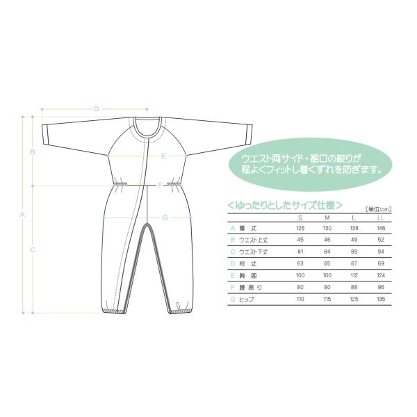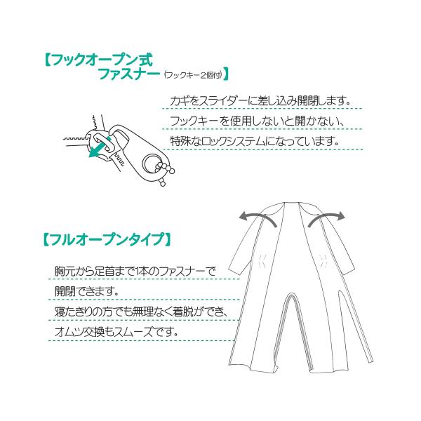 「制菌前開き介護用つなぎねまき」は、洗濯を繰り返しても制菌性能を維持するため、制菌効果が持続する介護用のつなぎねまきです。ファスナーには特殊なロックシステムを採用しているため、ご本人の開閉を防止します。 ●胸元から足首まで1本のファスナーで開閉できるフルオープンタイプのつなぎねまきです。 ●寝たきりの方でも無理なく着脱でき、おむつ交換もスムーズです。 ●ファスナーにはフックオープン式ファスナーを採用。付属のカギをスライダーに差し込み開閉します。フックキーを使用しないと開かない特殊なロックシステムになっています。 ●ウエスト両サイド・裾口の絞りがほどよくフィットし着崩れを防ぎます。 ●接触皮膚障害試験、突然変異原生(AMES TEST)、経口毒性(LD50)などの毒性テストに合格した抗菌剤を使用しています。 【サイズ】S:着丈126cm 裄丈63cm ヒップ110cm M:着丈130cm 裄丈65cm ヒップ115cm L:着丈138cm 裄丈67cm ヒップ125cm LL:着丈146cm 裄丈69cm ヒップ135cm 【カラー】ピンク 【材質】綿70%、制菌加工ポリエステル30% 【JAN】4560370334014