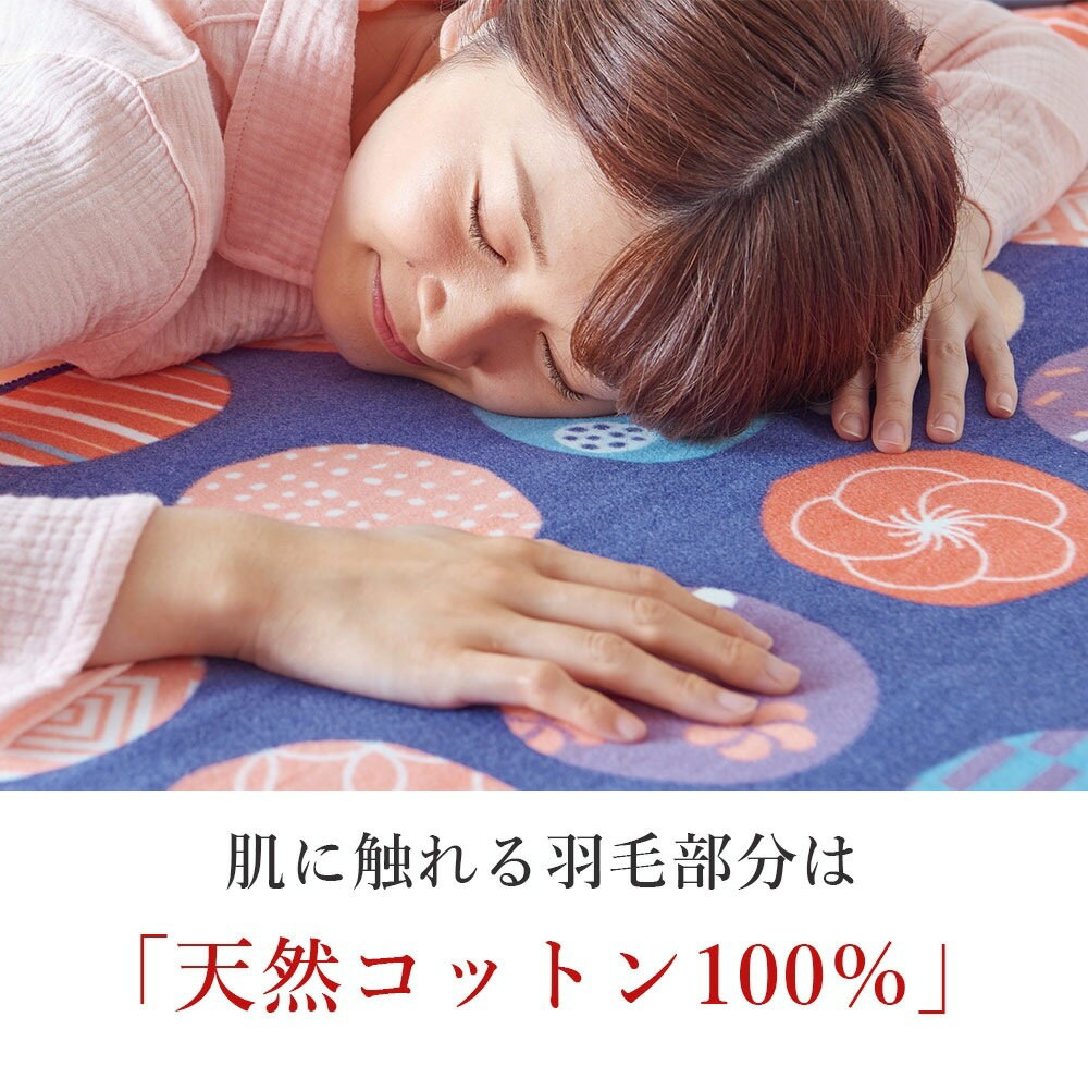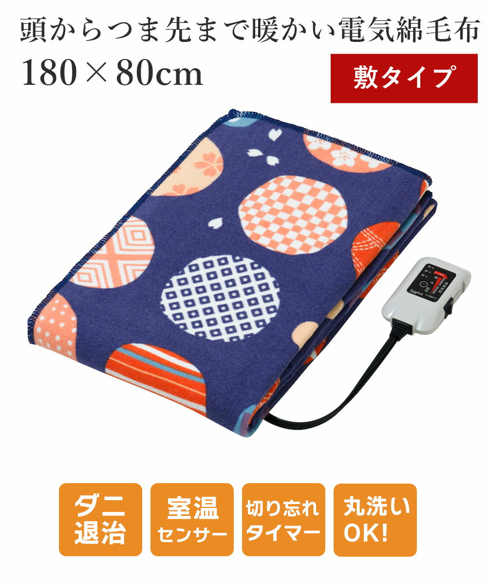 あったか電気毛布 電気で温度調節ができる敷毛布。快適に眠れます。 「さくら」をモチーフにしたオリジナルデザイン 紺色に花モチーフ柄がちりばめられた、華やかなデザインです。 3段階の温度調節 付属のコントローラーで簡単に切替ができます。 (強)約52℃ /(中)約36℃ /(弱)約23℃ タイマー機能付き 2時間/4時間/6時間で設定が可能。 さらに安心の電源切り忘れ防止「12時間自動OFFタイマー」つき。 ダニ退治機能付き 清潔さを保ち、安心してお使いいただけます。 丸洗いOK! 洗濯ネットに入れれば洗濯機で丸洗いができ、お手入れも簡単です。 外形寸法(約) 180cm×80cm 重量(約) 1.0kg 電気コード長さ(約) (電源側)約1.9m /(本体側)約0.6m 温度調節機能 (強)約52℃ /(中)約36℃ /(弱)約23℃で調節可能 材質 たて糸 ポリエステル100%/よこ糸 綿100%(毛羽部分) 生産国 日本 消費電力 55W 電気代(1時間あたり) (強)約0.9円 /(中)約0.5円 /(弱)約0.1円 仕様 ダニ退治、室温センサー、丸洗いOK、切り忘れ防止タイマー 【注意事項】 ・商品の詳細はご注文前にメーカーサイトもしくはカタログ等で御確認ください。