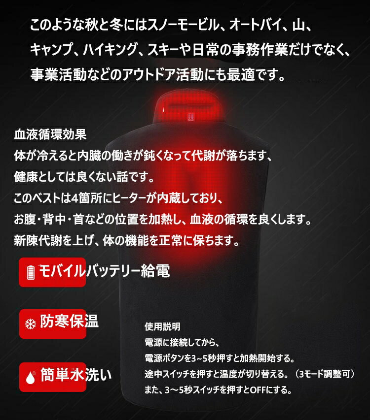 安全規格:PSE規格 届出事業者名 輸入元:株式会社 シーエージー ◆サイズが合わない、イメージと違う等の、お客様都合でのキャンセル・返品交換は対応致しかねます◆ 【商品詳細】 カラー:グレー、ブラック サイズ:S M L XL 2XL 3XL スタイル:4箇所発熱 生地:カーボン繊維+ポリエステル 原産国:中国製 電源:(USB式)モバイルバッテリー5V/2A(選択可能)モバイルバッテリーと接続しないと使用できません。 (別売)バッテリー:5V/2A 10000mah 温度調整:温度調整可能 3段温度調整 高温:約50℃(約4h) 中温:約40℃(約6h) 低温:約30℃(約8h) 【商品特性】 電熱ウェアの革新: 電熱ベストは、USB給電式のヒーターベストであり、3段階の温度調節機能を備えています。冷え性の方に最適な暖かさを提供します。 完全洗濯可能: プレミアムな電熱ベストは、手軽な洗濯が可能です。いつでも清潔に保つことができます。 4つのエリア発熱: 電熱ベストは4つの発熱エリアを備えており、体の要所で温かさをキープします。通学や通勤、勤務中の防寒対策に最適です。 男女兼用デザイン: 電熱ベストは、男性・女性を問わずにご利用いただけます。シンプルなデザインで、様々なスタイルに合わせることができます。 快適な暖かさ: 高品質な素材を使用し、快適な着心地を実現しました。寒い季節でも暖かさをキープし、快適な日常を提供します。 【適用シーン】 プレゼント、祝日のプレゼント、オフィス、自転車、スポーツ、ショッピング、ペットの散歩、室内、旅行、登山、ゴルフ、釣り、自転車、アウトドアの仕事、夜間の仕事、倉庫などこの冬 【適用対象】 メンズ、レディース、父、母、祖父、老人、祖母 【商品機能】 USB加熱、バッテリー給電、防寒 3段温度調整、 水洗い可能、撥水を防ぐ 製品の耐久性と加熱効果、内部線路の美観性を確保するために、ヒーターの配置を改良致しました。4つエリア発熱できます。 赤外線発熱します。性能は安定であり、感電危険性ゼロ、放射問題なし、安心的にご利用ください。 お体を効果的に保温して、電熱ベストが九つエリア発熱できます。同時に、背中、腰、腹部を暖めます。人体が一番寒に弱い所に温めるをくれます。 アウトドアウエアやカジュアルウエアに使える超暖かいインナー電熱服。三段階の温度調節でスイッチ一つで簡単操作、保温効果抜群繊維状のしなやかなマイクロカーボンファイバーを使用し、違和感なく着れます。 20代30代40代50代60代の方がおしゃれを楽しめながら、寒さ対策にもなります。特に寒さを感じやすいお年寄りのプレゼントに超おすすめ 最近、お客様から電源に関するフィードバックを受け取りました。電源を入れても発熱しない原因は使用されるバッテリーに負荷制御装置を内蔵することが原因である可能性があります。過電流が流れた際自動的に電流を遮断します。 電熱製品を購入する時バッテリーを一緒に購入することをお勧めいたします。 【使用方法】 1 ポケットからUSBコネクターを出します。 2 USBコネクターのカバーを外して、モバイルパッテリー(別売り)と接続します。 3 電源ボタンを3秒間長押すと赤ランプが点灯して、加熱状態になります。 4 電源ボタンで温度を調節することができます。 5 働く状態にまた電源ボタンを3秒間長押して、電源OFFになります。 【本体丸洗いOK】 本製品は、コントローラーを外すことで洗濯機で丸洗いが可能です。 ダニ退治機能も搭載されておりますので、ダニ退治後に丸洗いすることで清潔にご使用になれます。 洗濯の際は、洗濯ネットをご使用ください。 ドラム型洗濯機・衣類乾燥機はご使用いただけません。 【商品説明】 電熱ベストは、冷たい季節に優れた防寒対策を提供する洗えるUSB給電式のヒーターベストです。3段階の温度調節機能により、寒さに応じて最適な温かさを選ぶことができます。 4つの発熱エリアは、体の要所である背中や腹部を重点的に温めます。通学や通勤、勤務中の寒冷対策に最適です。また、男女兼用のデザインは、幅広いユーザーに対応し、シンプルなスタイルに合わせることができます。 高品質な素材を使用し、快適な着心地を追求しました。洗濯が可能なので、いつでも清潔に保つことができます。 電熱ベストは、寒い季節でも快適な暖かさを提供します。防寒対策とスタイリッシュなデザインを両立させた電熱ベストで、快適な日常をお過ごしください。 【注意事項】 ※手測りのため、少し誤差がございます。 ※画像はご覧になっているモニター、パソコン等により実際の商品と多少色味が異なる場合がございます。 ※本製品は海外輸入品となりますので、パッケージも海外パッケージ(中国/英語表記など)となっている場合がございます。 商品及びにパッケージの埃や傷 破損 へこみなどはご容赦ください。 ◆その理由による返品はお受け出来かねますのでご了承くださいませ。 ※商品がお手元に届きましたら、商品に不具合が無いかご確認ください。 万が一欠陥、不良、違う商品が届いた
