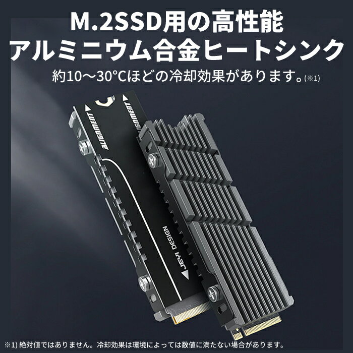 【製品仕様】 メーカー JEYI 製品名 M.2ヒートシンク FinsCold iCold-2 対応機器 M.2 NVMe / NGFF SSD 2280サイズ用 サイズ 幅24mmx長さ76mmx厚さ15mm 重量 約20g ※ネジ、サーマルパッド除く 材質 アルマイトアルミニウム合金 カラー ブラック 機能 M.2SSDの厚さに合わせた調節機能を搭載(厚さ4.1mmまで) 内容物 ヒートシンクx1、背面カバーx1、サーマルパッドx3(裏面用(赤)x1、表面用(青)x1、カット済みx1)、ネジx6、ドライバーx1 装着方法 1. 仮設置 サーマルパットから剥離シールを剥がさずに仮設置をして下さい。 SSDの表面(チップが搭載されている側)にカットされていないサーマルパッド(青色)、SSDの裏面にサーマルパッド(赤色)を重ねて下さい。 次に M.2SSDをヒートシンクと、ヒートシンクの背面カバーとの間に挟み込み仮組をして装着可能かご確認下さい。 ※M.2SSDの厚さによりネジ留めが出来ない、またはガタつきが生じる場合はサーマルパッドを外して厚さを調節したり、カット済みのサーマルパッドを重ねてガタつきが生じないようにして下さい。 2. 仮組みが完了しましたら、各サーマルパッドから剥離シートを剥がしてそれぞれのパーツに付着させて下さい。 3. 軽くヒートシンクを指で抑えて、付属のネジとドライバーでねじ留めをして下さい。 ドライバーが持ち難い場合は、市販の精密プラスドライバーでのご利用が可能です。 4. 各マザーボードの装着方法に沿って装着してください。 注意事項 ※2280サイズ以外のM.2SSDはご利用いただけません. ※ヒートシンク付きSSDはご利用いただけません。 ※ヒートシンクに装着する際には、パソコンの電源を抜いて内部電力を十分に抜き、静電気を除去した後にM.2SSDを外して装着して下さい。 ※掲載画像は製品イメージです。掲載写真と、ご提供品とでは色合いが違う場合があります。 ※一部掲載の数値は絶対値ではありません。すべての環境で同様の冷却効果をうたうものではありません。 保証期間 商品到着後30日間の店舗保証 配送に関しまして【出荷のタイミング・配送日】 配送に関します ご注意事項 当店をはじめてご利用頂く場合は必ず”配送について”をご参照ください。 【発送のタイミング】 ▼ 当店の出荷受付時間の締切は午後2時までとなります。午後2時までに決済が完了された場合にのみ当日出荷の手配が行われます。 午後2時以降のご注文・決済は翌日出荷となります。 ※商品の手配にお時間を要する場合は当日出荷が出来ない場合がございます。予めご了承下さい。 【ポスト投函便(メール便)について】 ▼ ”この商品の配送方法”欄に”メール便”が表記されている場合は、”メール便”配送方法が選択可能です。 当店では一般的なメール便よりも早い"ポスト投函便"での配送となります。(配送日時指定不可x / 代金引換の取り扱い不可x) また、受取人が在宅、不在宅に関わらずポスト並びに、宅配BOXに投函される事で配達が完了いたします。 【宅配便へ配送方法の変更】 ▼ ”この商品の配送方法”欄に”宅配便”が表記されている場合は、”宅配便”配送方法が選択可能です。 宅配便でのご注文の場合は宅配便の配送料金が適用され、宅急便で発送されます。 ※ポスト投函便配送料金無料の条件を満たした状態で、宅急便指定でのご注文の場合は、例外を除いて宅配便配送料金が発生しますのでご留意ください。 【複数点購入時 配送料金の店舗手動加算】 ▼ 当店にて複数点のご注文頂いた場合、楽天買い物カゴ(カートボックス)にて「配送料金が自動算入されません」。 店舗にてご注文内容確認の際、配送料金を再計算の上、ご注文確定メールにてご連絡となっております。 【複数個口分割配送となる場合】 ▼ 複数点ご購入の際、配送料金が加算される場合がございます 。 複数点ご購入、組み合わせ購入の際はできる限り「一梱包」で収まるよう手配させて頂いておりますが、梱包サイズが規定サイズを越える場合、複数個口便に分けての配送または、宅配便にての配送に変更(送料変更)させて頂く場合もございます。 複数個口便に分かれての配送になりました場合、個口数分の配送料金が加算(ご請求)となりますので、当店からお送り致しますご注文確認メール(*)を必ずご確認頂けますようお願い申し上げます。 (*)注文時楽天市場からお送りされる自動送信メールではございません。 ※特殊な例※ ポスト投函便配送商品の中に、購入可能数が「1」の商品がございます。これらの商品は1商品1梱包にての配送となりますため、購入数毎にポスト投函便配送料がかかり、別の商品と同梱にての配送はできません。製品特徴 ■ M.2 NVMe / NGFF SSDに対応した金属製の上下挟み込みタイプの放熱ヒートシンクです。 ■ M.2放熱ヒートシンクは、長時間使用で必ずと言っていいほど発生する熱暴走(サーマルスロットリング)による性能低下を低減する必須アイテムです。市販の22x80(mm)サイズ(タイプ2280)に対応しており、別途加工する事なくお手軽に装着する事ができます。 ■ SSDを表と裏