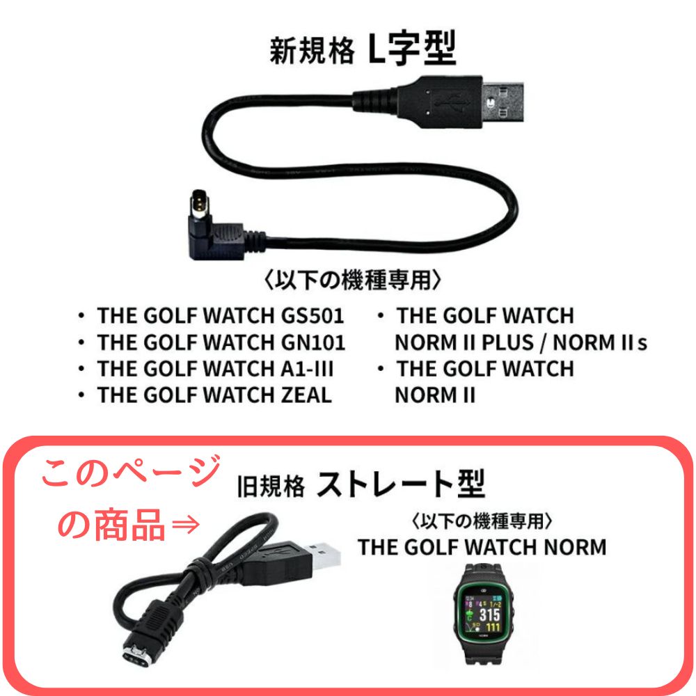 THE GOLF WATCH 専用 旧規格 ストレート型充電用ケーブル 【ゆうメール便対応商品】 本体に付属しているケーブルの単品販売です。 【対応機種】 ・ THE GOLF WATCH NORM 【ご注意】 ※本商品は、上記以外のゴルフウォッチシリーズには一切お使いいただけません。 ※NORM IIシリーズ/ZEAL/A1-III/GN101/GS501用の新規格 L字型充電ケーブルはこちら>> ※発送後の返品・返金や、商品の変更は出来かねます。お間違いの無いようご注意ください。