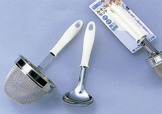 商品仕様 ●材質:ステンレス / ポリプロピレン ●サイズ:φ90×230mm ●原産国:日本製(燕三条) 商品の特徴 ●味噌こしとミニお玉のセットです。 ●毎日の味噌汁作りに便利です。 ●ミニお玉でみそをすくって、みそこしで溶かしてください。お玉とみそこしの便利なセット。