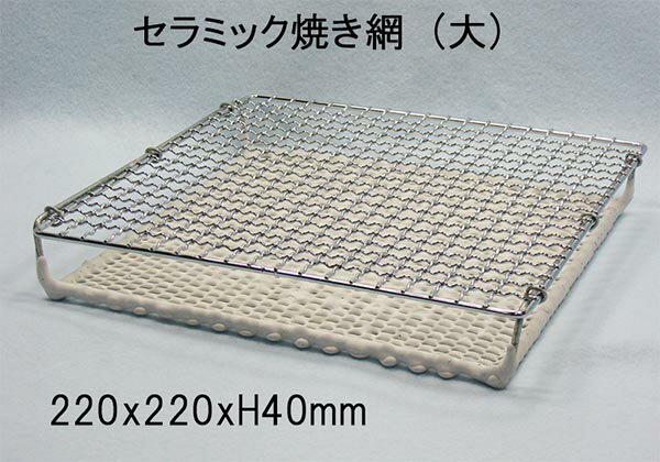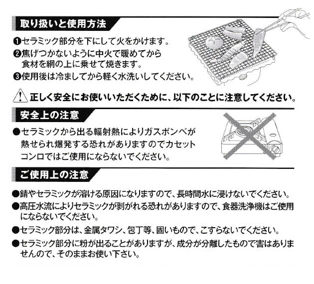 商品仕様 ●材質:底:セラミックス 上部:鉄(クロムメッキ) ●サイズ:220x220xH40mm ●原産国:日本製 丸十金網 商品の特徴 ●22cm のセラミック焼き網(大)です。 ●セラミックの遠赤外線効果で美味しく、ふっくら仕上がります。 ●キッチン備え付けのガスコンロか、卓上用の固形燃料を使用するタイプのコンロ上で使用できます。 アウトドア用品のガスバーナーなど、カセットボンベを使用する調理器具でのご使用は、セラミックの輻射熱の影響でボンベが爆発する恐れがあるためご使用できません。 ●セラミック部分を下にして火にかけます。 ●食材をのせる前に焼き網を温めておくことで、網に食材がくっつくことを防止できます。 ●メンテナンスも楽で、焼き時間も短く、パンだけではなく、野菜や魚、お餅なども。 ●トースターの代わりとして使えます。 ※IH不可。 ※カセットコンロ不可(遠赤効果でボンベが過熱されて危険です。 ※使用後は熱を冷ましてから洗ってください。 関連商品 セラミック焼網(小)セラミックの遠赤外線効果でパンがふんわり焼き上がります。