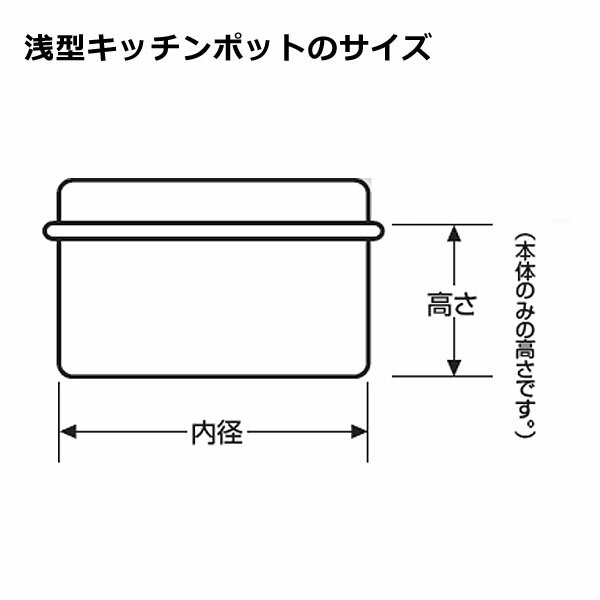 商品仕様 ●材質:18-8ステンレス ●サイズ:直径180×H97mm ●容量:約2.5L ●原産国:日本製(燕三条) ●製造元:新潟県燕市 赤川器物 商品の特徴 ●浅型のキッチンポット(18cm)です。 ●衛生的なステンレス製。 ●フタの置き場に困らないひっかけ金具付きの蓋。 ●薬味や下ごしらえした食材などを入れておけます。 ●飲食店の厨房などで使う業務用として作られています。 ※18-8は、ガス火は可ですが、IH(電磁調理器)は不可です。薬味や食材入れに便利な丸型のステンレスキッチンポット。