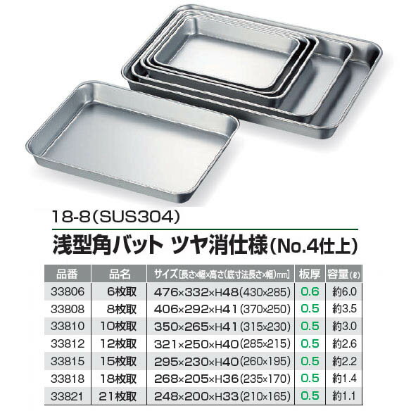 浅型角バット(8枚取り)No.4 ツヤ消し仕様 ホテル・レストラン 食堂 ラーメン店 業務用 厨房用品