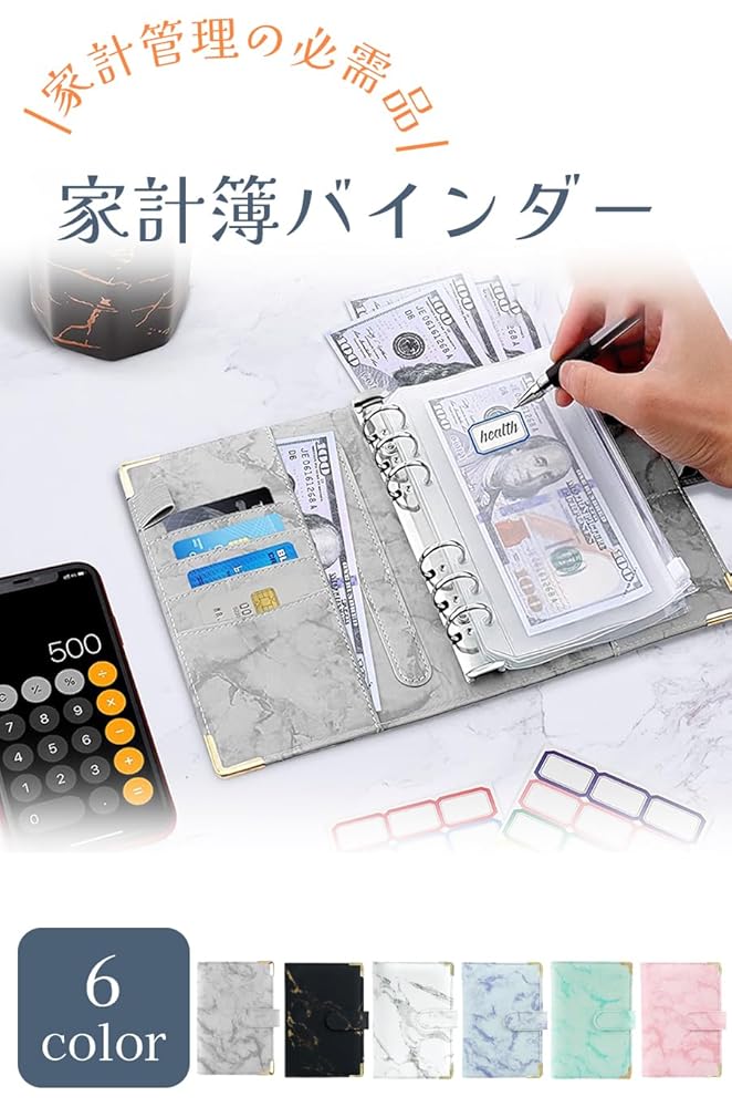 ideamall 家計管理 ポーチ 家計簿 予算バインダー ファイル ポケット12個付き お金管理 予算管理 大理石 A6
