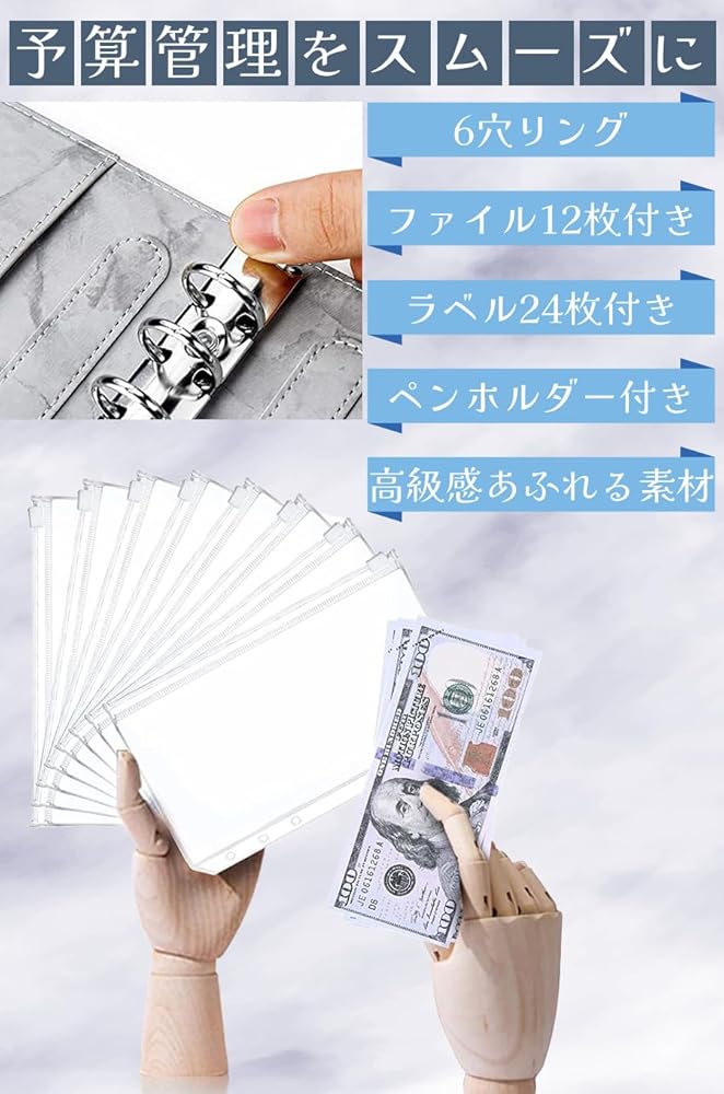 商品情報 主な仕様 【大容量予算バインダー】手帳カバー(6穴リングルーズリーフバインダー)、ファスナー付きPVC素材のファイル12枚、ラベル24枚が含まれる。予算管理バインダー一式です。 【ラクラク予算管理】月間のお金を計算し、貯金をスムーズに行うことができます。領収書やレシートも収納できます。 【マルチケース】便利なファスナー付きファイルには、お金や領収書など管理に必要な物を収納することができます。 【商品サイズ】 19cm×13cm