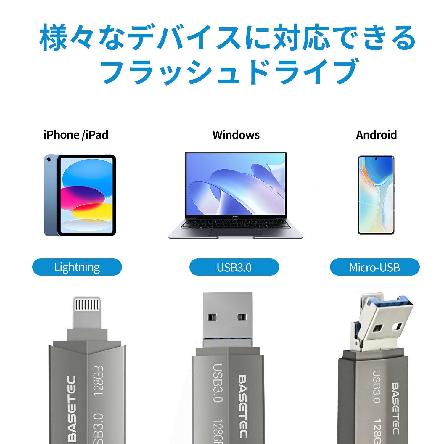 【容量が選べるUSBメモリ新登場】 BASETECのUSBメモリは、容量128GB/256GBの2種類を取り揃えております。ご注文の際は、用途に合わせてどちらかお好きな容量をお選びいただけます。 大容量のUSBメモリなので、多くのデータを保存することが可能です。容量不足の時でも、大切なデータを残しておきたいという方にお勧めの商品です。 【容量不足解消】 BASETECのUSBフラッシュドライブは、ios機器やマイクロUSBタイプのAndroidスマートフォンの拡張メモリとして利用できるので、iPhone/Android携帯等の容量不足を解消します!また、音楽やドキュメント等の豊富なファイルを保存することができます。保存したデータは専用アプリで簡単に管理ができます。 【高速転送】 データの高速転送が可能なUSB3.0ポートあり!USB3.0ポートに対応している使用機器であれば短時間での転送が可能です。 USBフラッシュドライブに素早く取り込むことで、iPhone/Android携帯等の空き容量を増やします。 【直接保存や再生も可能】 インターネットがない環境でも、フラッシュドライブに保存したメモリから直接ビデオや音楽を再生して楽しむことができます。また撮影した動画や写真のデータを、iPhone/Android携帯などの容量を使用せず、フラッシュドライブに直接保存することができます。iPhone/Androidの空き容量が少なくても、撮影可能です。 【幅広い互換性】 このUSBフラッシュドライブは、多くの機種に対応しており、幅広い互換性を持ち合わせています。:iOS(携帯電話/Pro/Plus/Max、iPad/Air/Mini、iPod)、USB (Windows 7/8/10/11/Vista / XP / 2000 / ME / NT Linuxに対応)、マイクロ(マイクロUSBインターフェースを備えたAndroidスマートフォン用のマイクロUSBインターフェース。 S6/ S7 / S4/S5/S3/S2/Samsung A7など)。 メーカー希望小売価格はメーカーサイトに基づいて掲載しています 【確認・注意事項】 ●本製品を使用し、データの消失やデバイスに不具合が起こった場合、弊社では一切の 責任を負いかねます。 ●本製品は汎用品となります。お使いのデバイス、OSのバージョンによってはご使用いた だけない可能性がございます。 ●お子様や意思表示が困難な方の使用、及び乳幼児の手の届く場所でのご使用、保管は しないでください。 ●水濡れ、高温多湿な環境での使用はしないでください。 ●分解、修理はしないでください。 ●本製品の使用や故障によって生じた損害について、直接、間接問わず弊社では一切の責 任を負いかねます。予めご了承ください。 ●改良や仕様変更により、商品ページ、カタログ、取扱説明書と一部仕様が異なる場合 がございます。予めご了承ください。 ●重要なデータの移動時は必ずバックアップを行い、データの移動を行ってください。 (本製品を使用してのデータの消失・破損・お使いの機器の不具合については 弊社は一切の責任を負いかねます。) ●動作中(操作完了前)やシャットダウン中でも記録媒体がファイルの読み書きをしている ことがございます。説明書に記載している各端末の「本製品、記録媒体の安全な取り出し 方法」をご確認いただき、取り外しを行ってください。正しい方法で取り外しを行わない場合、 エラーやデータの消失、破損が起きる可能性がございます。関連商品はこちら 最大35W急速充電器セット 1,480円~ 新発売!色と長さが選べるシリコンケーブル 780円~ 商品名: BASETEC(ベーステック) 128GB USBメモリ 【タイプが選べるUSBメモリ新登場】 BASETECのUSBメモリは、容量128GBのTypeC非対応またはType-C対応の2種類を取り揃えております。ご注文の際は、用途に合わせてどちらかお好きな容量をお選びいただけます。 大容量のUSBメモリなので、多くのデータを保存することが可能です。容量不足の時でも、大切なデータを残しておきたいという方にお勧めの商品です。 【容量不足解消】 BASETECのUSBフラッシュドライブは、ios機器やマイクロUSBタイプのAndroidスマートフォンの拡張メモリとして利用できるので、iPhone/Android携帯等の容量不足を解消します!また、音楽やドキュメント等の豊富なファイルを保存することができます。保存したデータは専用アプリで簡単に管理ができます。 【高速転送】 データの高速転送が可能なUSB3.0ポートあり!USB3.0ポートに対応している使用機器であれば短時間での転送が可能です。 USBフラッシュドライブに素早く取り込むことで、iPhone/Android携帯等の空き容量を増やします。 【直接保存や再生も可能】 インターネットがない環境でも、フラッシュドライブに保存したメモリから直接ビデオや音楽を再生して楽しむことができます。また撮影した動画や写真のデータを、iPhone/Android携帯などの容量を使用せず、フラッシュドライブに直接保存することができます。iPhone/Androidの空き容量が少なくても、撮影可能です。 【幅広い互換性】 このUSBフラッシュドライブは、多くの機種に対応しており、幅広い互換性を持ち合わせています。:iOS(携帯電話/Pro/Plus/Max、iPad/Air/Mini、iPod)、USB (Windows 7/8/10/11/Vista / XP / 2000 / ME / NT 
