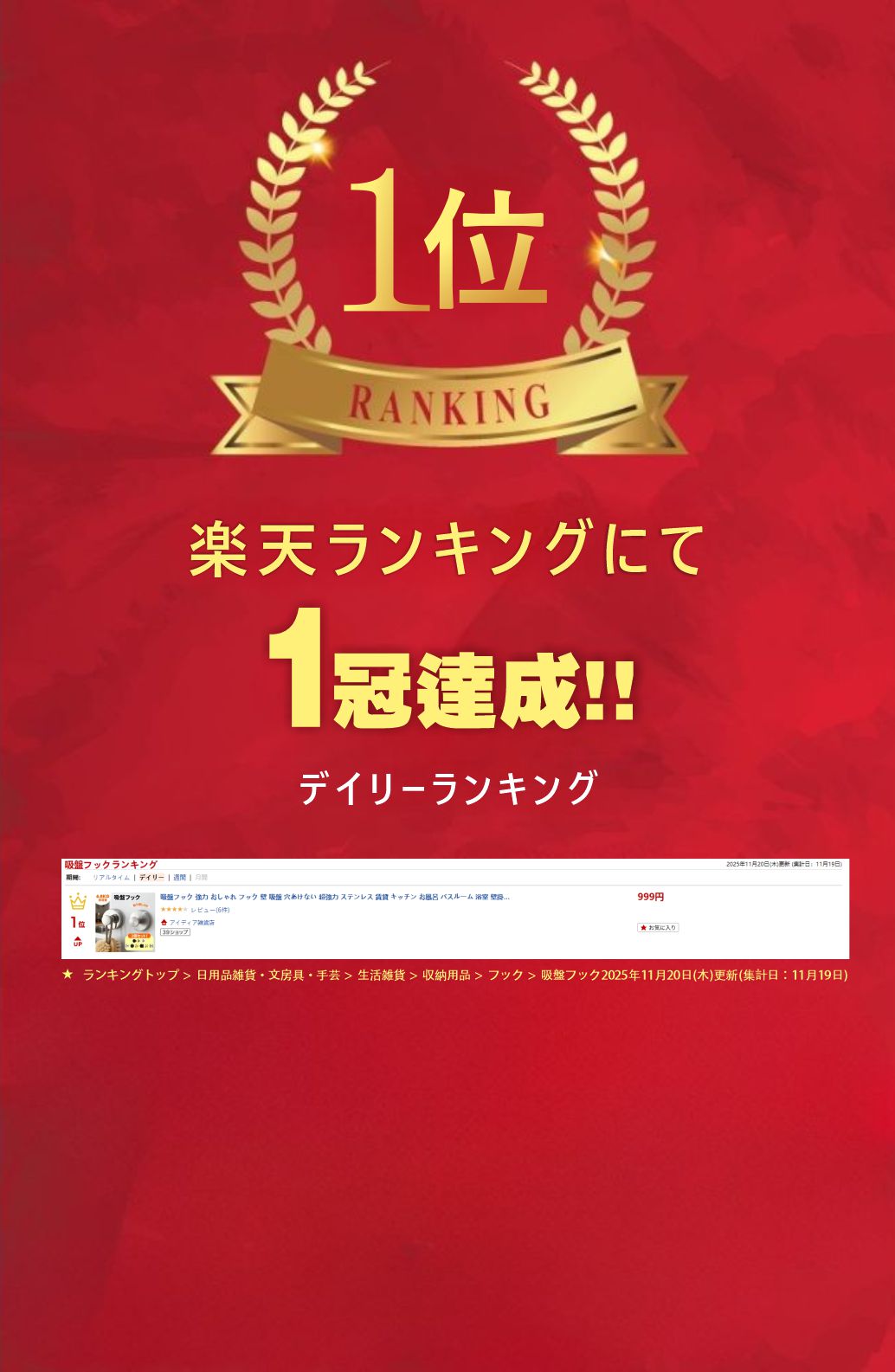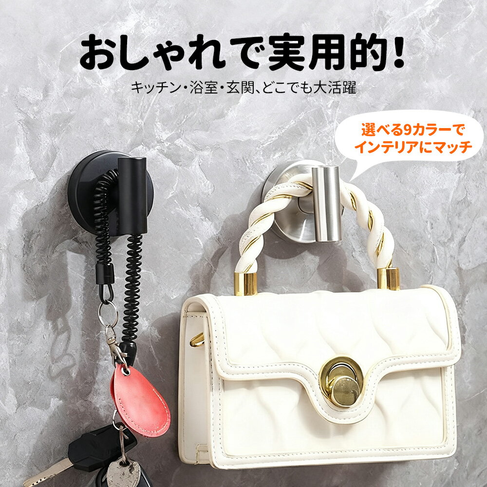 \穴あけ不要!繰り返し使える 強力吸盤フック/ 工具なしでペタッと貼るだけ。重い物も安心の耐荷重6.8kg。賃貸でも壁を傷つけず、キッチン・浴室・玄関など家中で大活躍! 貼り直しOK・水洗いで粘着力復活・2個セット 【おすすめポイント】 耐荷重6.8kg:鍋・バッグ・掃除道具もしっかり固定。 工具いらず:壁を拭いて押し付けるだけ。穴あけ不要で賃貸も安心。 繰り返し使える:吸盤が汚れても水洗い→乾かせば粘着力が戻る。 防サビ・高耐久:ステンレス+ABSで湿気の多い場所でも安心。 選べるタイプ&カラー:ミラーT字/コート/直角の3種類 × シルバー・ブラック・ゴールド。 【使える場所】 ・ キッチン:タオル、調理ツール、エコバッグ掛けに。 ・ バスルーム:ボディタオル、スポンジ、掃除用具の定位置に。 ・ 玄関:鍵やバッグ、帽子の一時掛けに。 ・ リビング/ベランダ:小物整理や仮置きに。 【取り付け手順】 1)壁面をきれいに拭き、乾かす。 2)吸盤の保護フィルムをはがす。 3)壁に押し付けて空気を抜く。 4)しっかり密着したら完了。貼り直しOK。 【セット内容/種類・カラー】 ・ 2個セット ・ 種類:吸盤ミラーT字フック/吸盤コートフック/吸盤直角フック ・ カラー:ヘアラインシルバー/ブラック/ゴールド 【商品仕様】 商品名:穴あけ不要 強力吸盤フック(2個セット) 材質:ステンレス+ABS 耐荷重:最大 6.8kg 使用範囲:トイレ/キッチン/ベランダ/バスルーム ほか お手入れ:水洗い可(乾燥後に再貼り付け) 【ご使用上の注意】 ・ 凹凸やザラつきのある面、油分・水分が残る面には密着しにくい場合があります。 ・ 取り付け後は軽く引っ張って固定を確認してください。 ・ 重量物を掛ける際は、まず軽量物で密着状態をお試しください。 【こんな方におすすめ】 ・ 賃貸で壁に穴をあけたくない。 ・ 強力で落ちないフックが欲しい。 ・ 見た目もおしゃれで、場所を選ばず使いたい。 今すぐお試しください。しっかり固定・繰り返し使えてコスパ抜群!