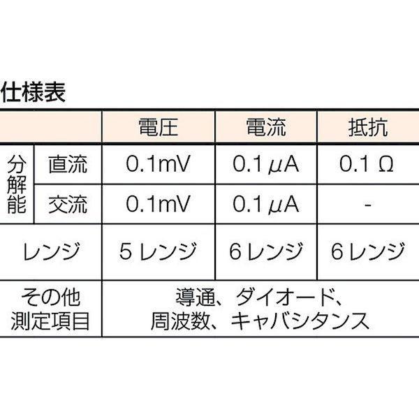 【特長】●端子の誤挿入防止シャッター機能付です。●CE規格品です。【用途】●電気・電子回路設計、製造、検査、電気工事等に。【仕様】●直流電圧(V):1000●交流電圧(V):1000●直流電流(A):10●交流電流(A):10●抵抗(Ω):60M●幅×奥行×高さ:90×49×192mm●連続使用時間:約300時間●最大表示(カウント):6000●検波方式:真の実効値整流(RMS)●電源:単3乾電池(R6)×4本(付属)【原産国】タイ