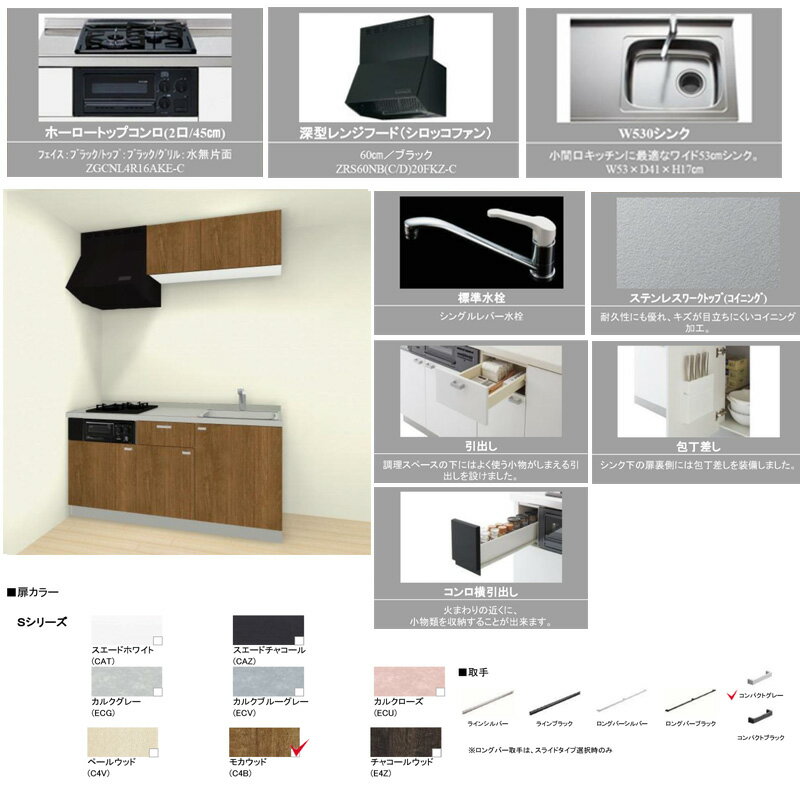 ・掲載商品については、商品のみ価格です。 ・販売は商品のみであり、工事・施工などは付帯されておりません。工事の手配は、ご注文者様にて行う必要があります。 ・システムキッチンについては、別途組み立て・設置を行っていただく必要があります。 ・配送について4tロング車(全長8440mm 全幅2240mm 全高2440mm)での配送となります。配送可能か確認してください。 ・荷受については、軒先下ろしです。また再配達不可能となりますのでご理解ください。 ・納期については納期確定後の納入日変更は不可です。 メーカー希望小売価格はメーカーカタログに基づいて掲載しています商品シリーズ Colty(コルティ) 扉シリーズ Sシリーズ 扉カラー スエードホワイト(CAT)・スエードチャコール(CAZ)・カルクグレー(ECG)・カルクブルーグレー(ECV)・カルクローズ(ECU)・ペールウッド(C4V)・モカウッド(C4B)・チャコールウッド(E4Z) キャビネットカラー アイボリー 取手 コンパクトグレー・コンパクトブラック 取手の色がグレーの場合、けこみ色はグレー取手の色がブラックの場合、けこみ色はブラック 間口・奥行き・高さ 165cm・60cm・85cm キッチンレイアウト I型・開き扉 ワークトップ ステンレス/コイニング シンク種類 ステンレスシンク W530シンク(S5)/ステンレス 水栓金具 標準水栓 調理機器 ホーロートップコンロ 2口グリル水無片面焼きフェイス:ブラック トップ:ブラック 間口450mm レンジフード W=60cm/深型レンジフード シロッコファン 吊戸棚/オプション H=400mm/セミショート吊戸棚 不燃仕様 開放防止部品 なし ・掲載商品については、商品のみ価格です。 ・販売は商品のみであり、工事・施工などは付帯されておりません。工事の手配は、ご注文者様にて行う必要があります。 ・システムキッチンについては、別途組み立て・設置を行っていただく必要があります。 ・配送について4tロング車(全長8440mm 全幅2240mm 全高2440mm)での配送となります。配送可能か確認してください。 ・荷受については、軒先下ろしです。また再配達不可能となりますのでご理解ください。 ・納期については納期確定後の納入日変更は不可です。 メーカー希望小売価格はメーカーカタログに基づいて掲載しています