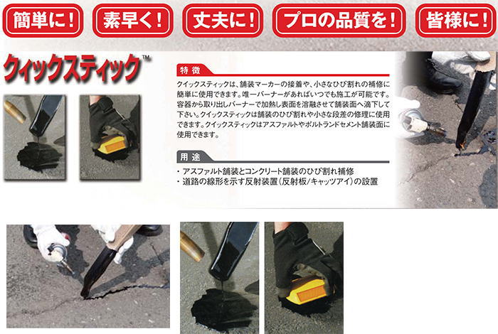 クイックアスファルト補修材舗装のひび割れをカンタンに補修!クイックスティックは舗道マーカーを接着させるか、または小さなひび割れ修理をするのに簡単に使用できます。 施工には唯一バーナーがあればいつでも可能です。用途アスファルト舗装とコンクリート舗装のひび割れ補修道路の線形を示す反射装置(反射板/キャッツアイ)の設置製品の特長唯一バーナーがあればいつでも施工が可能容器から取り出しバーナーで加熱し表面を溶融させて舗装面へ滴下してください。舗装のひび割れ補修や小さな段差の修理に使用できます。アスファルトやポルトランドセメント舗装面に使用できます。適応条件用途:アスファルト・コンクリート舗装クラッククラック幅:3mm以上ひび割れ率:35%未満路面適応温度:-22度〜64度施工外気温度:4度以上天候:晴れ等(雨天施工不可)ASTM規格:標準仕様コーン針入度(25度):25dmm以下軟化点:93度以上伸度(25度):15cm以上伸度(4度):5cm以上フラース脆化点:-6度で曲げても割れませんアスファルト相溶性:適合する加熱安定温度:210度最適流動温度:193度製品仕様:1本のサイズ・・・(約)4cm×3cm×60cm1箱あたり6本入り(約1kg/本)1本で5〜6m注)クラックの幅や深さによりことなります。
