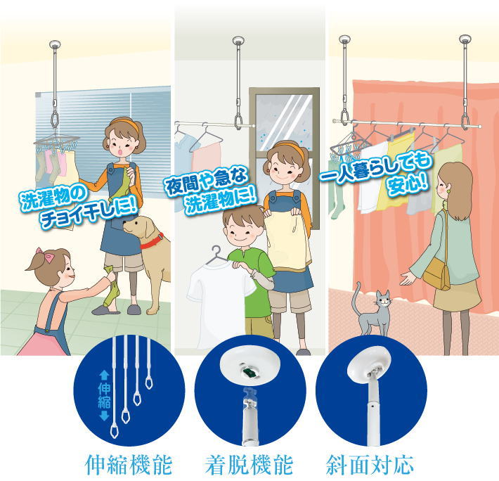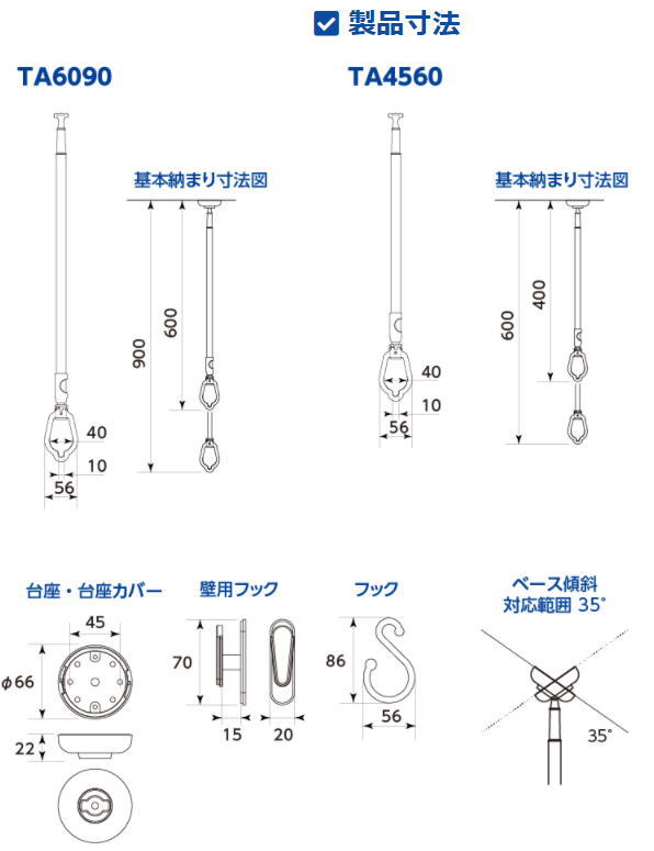 吊下げ型室内物干しTA6090-BPA必要なときだけ取り付けて使えるスッキリ収納タイプの室内物干し「吊下げ型室内物干し」は天井から吊下げることができるポール型の物干掛けです。1本で直接ハンガーを掛ける、2本で物干竿を取り付けるなど生活スタイルに合わせた使い方ができます。上下伸縮で長さ調節もできます。用 途 天井吊下げ型の室内物干し材 質 アルミ押出形材、ABS、PP、POM等付属品 天井取付けネジ2本、収納用フック1個、収納用フック取付けネジ2本、S字フック1個寸 法 φ66mm×600mm カラー ホワイト(W)単 位 1本総重量 約400g洗濯物重量 8kgまで取付けに必要な道具 下地検知器、キリ、プラスドライバー