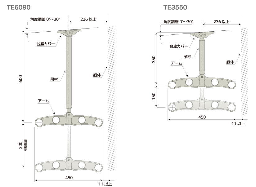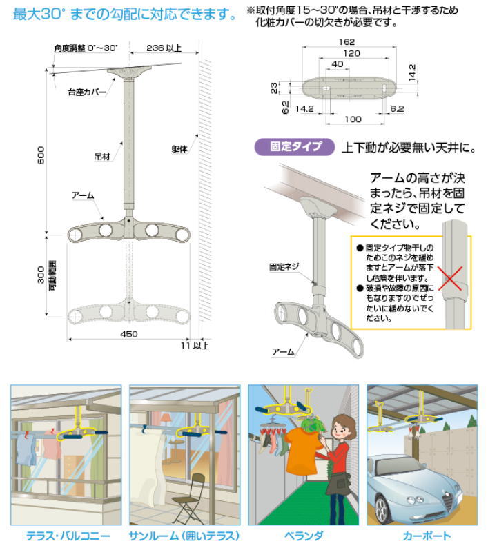 DRY・WAVE(ドライ・ウェーブ) 吊下げ型物干金物(600mm〜900mm範囲で固定) ステンカラー (2本で1組) TE6090(ステンカラー)ベランダ・カーポートなどで使える吊下げ型物干し(固定タイプ)室外の天井部に取り付けてご使用になれます。テラス・バルコニー、サンルーム(囲いテラス)、ベランダ、カーポートなど生活のあらゆるシーンでご利用いただける室外用物干し掛けです品 名 吊下げ型固定式物干金物(着脱機能付)DRY・WAVE(ドライ・ウェーブ)型 番 TE6090用 途 室外吊下げ型の物干し掛け材 質 アルミ押出形材、アルミダイカスト、ステンレス、PP・POM等付属品 −寸 法 幅450mm×奥行39mm×高さ628mmカラー ステンカラー(ST)単 位 1セット:2本入り 総重量 約2020g(1セット)洗濯物重量 20kg(1セットあたり) 取付けに必要な道具 電動ドリル、+ドライバー、六角レンチ