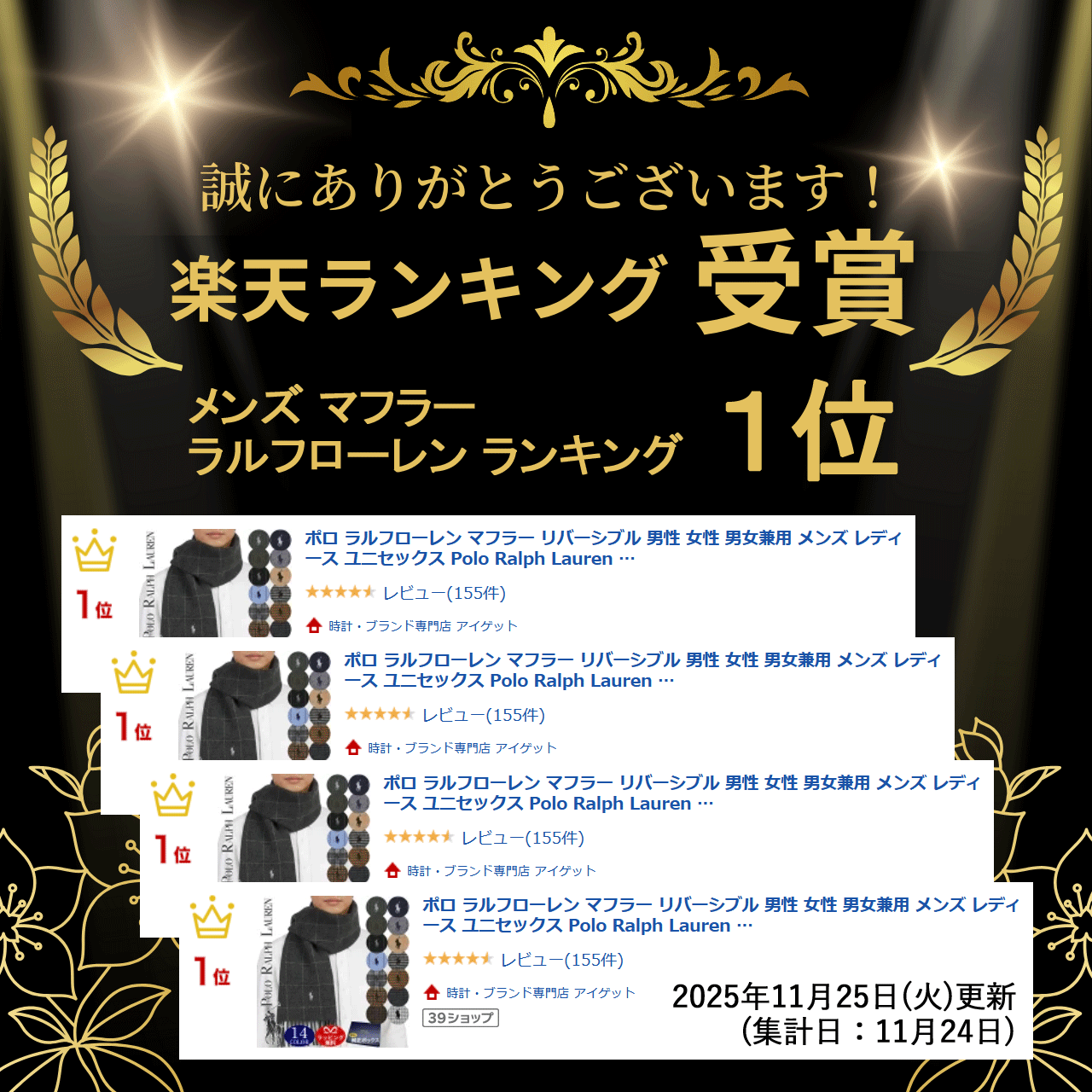 ポロ ラルフローレン Polo Ralph Lauren マフラー 選べる13色 【製品仕様】 コードNo PC0743、PC0945 カテゴリ マフラー サイズ 《全長》182cm(本体166cm、フリンジ8.0cm×2)《幅》25.5cm カラー A チャコールグレー(PC0743-047)B ネイビー(PC0743-433)C グリーン(PC0743-350)D ライトグレー(PC0743-021)E ブラック(PC0743-001)F キャメル(PC0743-220)G フォールブルー(PC0743-450)H ブラックチェック(PC0945-003)I グレーチェック(PC0945-037)J キャメルチェック(PC0945-221)K ブラウンマルチ(PC0945-241)L ネイビーチェック(PC0945-406)M オリーブチェック(PC0945-312)N 格子ライトグレー(PC0945-032) 素材 ヴァージンウール80%、ナイロン20% 生産国 イタリア 付属品 なし ご留意点 ※ラッピングご希望の方はご注文時にお申し付けください。当店が用意した包装資材を使ってラッピングいたします。 ※モニター設定や環境の違いにより、実際の商品と色味・質感が多少異なる場合がございますので、予めご了承くださいませ。 ※並行輸入品のためPolo Ralph Laurenの定める保証は適用外です。 ※並行輸入品について ロゴ入り専用BOX ラッピング 「お世話になったあの方へ」「大切なあの人へ」「ご家族の記念日に」日頃の感謝の気持ちを贈ってみませんか。☆大切な日のお役立ち☆想いが一層伝わる贈り物になりますよう、私たちアイゲットがお手伝いさせていただきます。贈られる方のお気持ちも一緒にお伝えするようなラッピングを心掛けています。ラッピングは無料です。ご注文時に備考欄でお申し付けください。【プレゼント】【ギフト】【贈り物】【お礼】【景品】【ご褒美】【誕生日】【バレンタインデー】【ホワイトデー】【ハロウィン】【クリスマス】【母の日】【父の日】【こどもの日】【敬老の日】【結婚祝い】【結婚記念日】【出産祝い】【入学祝い】【合格祝い】【卒業祝い】【就職祝い】【成人祝い】【昇進祝い】【栄転祝い】【定年退職祝い】【開店・開業祝い】【新築祝い】【引っ越し祝い】【病気全快】【歓迎会】【送迎会】【忘年会】【新年会】【お中元】【お歳暮】★その他のマフラーをお探しの方へ ポロ ラルフローレン Polo Ralph Lauren マフラー ポロラルフローレンのマフラーです。控えめな柄ですので、その日のファッションに自然と馴染み、「無地は物足りない」という方へオススメします。裏地は表地と異なるデザインになっていて、リバーシブルで楽しめる便利な一枚です。暖かくほど良い厚みが心地いいですよ。お馴染みのポニーもしっかりと刺繍されています。ユニセックスですので、ご家族やパートナーと色違いでお使いいただけますね。182cmのロングタイプですので、いろいろなアレンジが可能です。 毎冬完売してしまうラルフローレンの人気マフラー。人気の秘密は、どんなスタイリングでも外さないオーソドックスなデザイン。リバーシブルで使えるのも嬉しいポイント。気取らず、軽やかで保温性も◎コスパも抜群なので、デイリー使いにピッタリ。だからこそ長く愛され続ける名作マフラーです♪