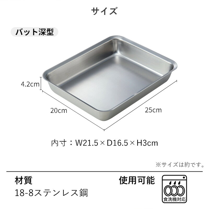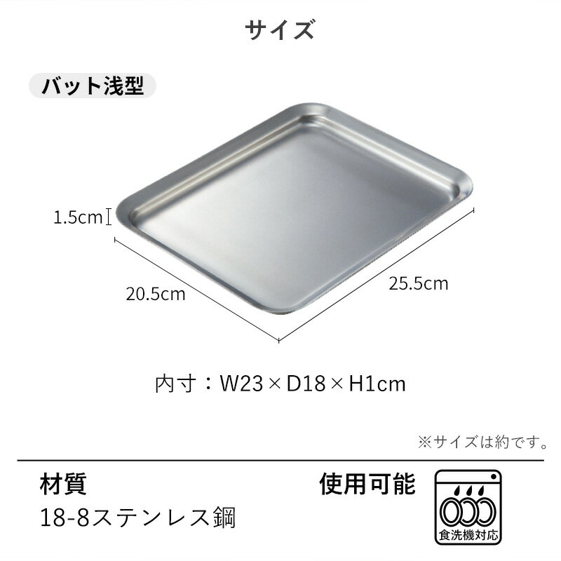 商品説明商品名ステンレス 角バット ざる セット サイズ【バット浅型】 サイズ:約W25.5×D20.5×H1.5cm 内寸:約W23×D18×H1cm 【バット深型】 サイズ:約W25×D20.4×H3.5cm 内寸:約W21.5×D16.5×H3cm 【角ざる深型】 サイズ:約W25×D20.4×H3.5cm 内寸:約W21.5×D16.5×H3cm 材質18-8ステンレス鋼 原産地中国 商品詳細●積み重ねやすい角型 ●浅型はフタとしても使用可能 ●油切り・水切りに便利な角ざる ●さまざまな調理に ●汚れが溜まりにくいフチでお手入れ簡単 ●丈夫で錆びにくいステンレス製 ●食洗機対応 注意事項※使用後は良く洗って乾燥させてください。 ※食器用洗剤を含ませたスポンジで洗い、硬いブラシなどは使用しないでください。 ※腐食する恐れがあるため漂白剤や磨き粉の使用は避けてください。 ※長時間水に浸さないでください。 ※ステンレスの製造上、細かな傷や継ぎ目・溶接跡がある場合がありますが、使用上の問題はございませんので予めご了承ください。 ※商品の色はモニターの具合で実物と若干異なる場合がございます。予めご了承下さい。 ※光、角度、撮影機器の演色などの理由により、色の見え方が異なる場合があります。 メーカー霜山株式会社 バリエーションバット浅型 バット深型 ざる深型 3点セット 検索用キーワードザル 野菜水切り ざる ステンレス 揚げ物 バット 揚げ物 バット キッチン用品 キッチンセット ステンレスバット バット 料理 てんぷら 水切りざる キッチン用品セット バット キッチン 食洗機対応 ざる 天ぷらバット 四角 ザル ザルセット ステンレス 角 ざる キッチン ステンレス 角ザル 角バット ステンレスバット 角型ザル セット 油切り バット 角型 バット 食洗機対応 浅型ザル ステンレス バット 深型 油切り キッチン ザル 霜山自由に組み合わせ可能なステンレスボルコラセット 1,280円〜 送料無料 ボウルとざるが一体化された ステンレスざる! 2,580円 送料無料 シンクの幅に合わせて自由に調節可能!伸縮式水切りかご 3,680円 送料無料 食器の水切りにも、野菜洗いにも!ステンレス製の水切りラックかご 1,980円〜 送料無料 自動開閉式のステンレスイルボトル!食洗機対応 2,980円〜 送料無料 大人気の食洗機カゴ、 大きいサイズが新登場! 2,380円 送料無料
