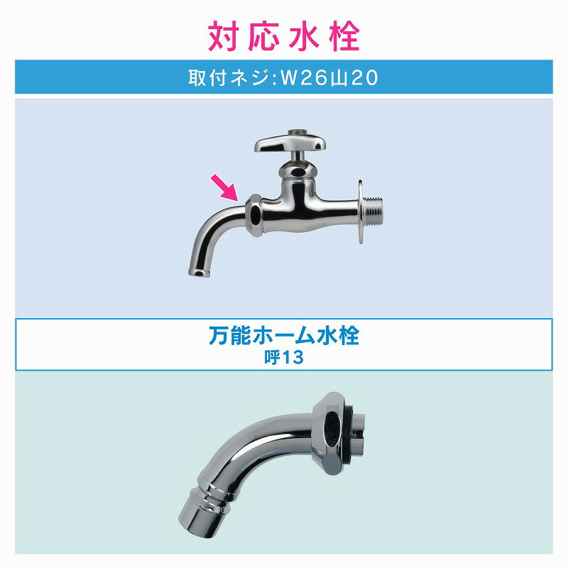 ※商品画像は代表型番のイメージです。型番通りのお手配になります。(色・形)等、確認の上ご注文下さい。 ◆水栓と洗濯機給水ホースをワンタッチで接続できるニップルです。 ◆呼び13の万能ホーム水栓・自在水栓・2ハンドル混合栓に取付できます。(取付対応ネジ:W26山20) ◆吐水口は回転式の為、どの方向にもホースを接続できます。 ◆ほとんどのメーカーの給水ホースが取付可能です。
