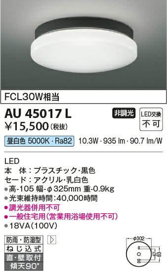 βコイズミ 照明【AU45017L】エクステリア 軒下シーリング LED一体型 非調光 昼白色 FCL30W相当 防雨・防湿型 黒色