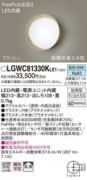 βパナソニック 照明器具【LGWC81330KLE1】ポーチライト FreePaお出迎え センサあり(フラッシュ) 段調光省エネ型 防雨型 ネジ込み方式 昼白色 拡散 {E}