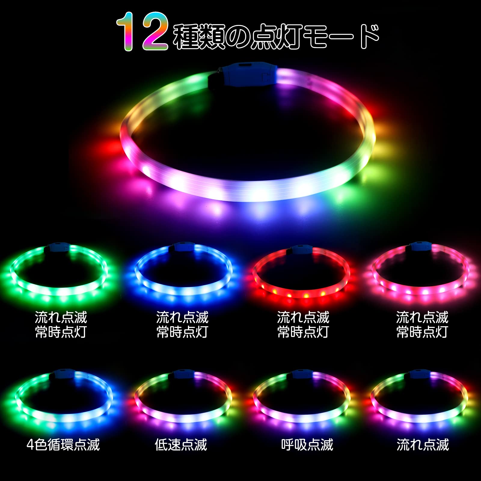 商品情報商品の説明主な仕様 【業界最新・12種類発光モード】:この光る首輪 には常時点灯、流れ点滅の2発光モードが搭載され、カラーはレインボー、赤、青、緑、ピンクから選ぶことができ、スイッチを押すだけで色とモードを順次に切り替えることができます。流れ点滅を設定すると、より気づいてもらいやすくなります。(点灯手順:虹色・低速/呼吸点滅→赤・常時/流れ→青・常時/流れ→緑・常時/流れ→ピンク・常時/流れ→4色循環点滅→虹色・点滅)br【超高輝度・高い視認性】ペット 光る首輪は19個の高輝度LEDを採用されて犬の視認性と安全性を最大限に向上させます。可視性が500m以上あるので、遠くから走ってくる車やバイクや自転車にも気づいてもらいやすいです。 暗い夜道の中でも愛犬の存在を知らせてくれるので安心して歩くことができます。安全対策として夜間のお散歩には欠かせない犬用ライト首輪。br【USB充電式・長時間点灯】ペットLED首輪はUSB充電式なので電池はいらず、経済的で省エネ。約2時間でフル充電でき、約10〜12時間の連続点灯ができます。防水効果ありますので、雨など水が普通に飛び散り付着する場合は大丈夫です。ティッシュや毛布などで拭き取ればいいです。バッテリーの部分に水が入らないようにご注意ください。br【サイズ調整可能】:ペットライト 首輪の長さは約70cm、愛犬の首周りに合わせてハサミでカットすれば、簡単にサイズ調節が可能です。トイプードル、チワワ、テディ、猫などの中小型ペットから、アラスカマラミュート、秋田犬などの大型犬まで対応できます。柔らかいシリコン素材を採用され、軽量で肌触りが良く、長時間装着しても首にストレスを与えません。2回目の調整のために余分な位置を確保しておくことをおすすめします。(調整可能の範囲:38-70cm: ご購入前に首周りのサイズを一度測定してご確認をお願いします)br【セット内容】セット内容:光る首輪*1、usbケーブル*1、プラスドライバー*1、説明書*1。