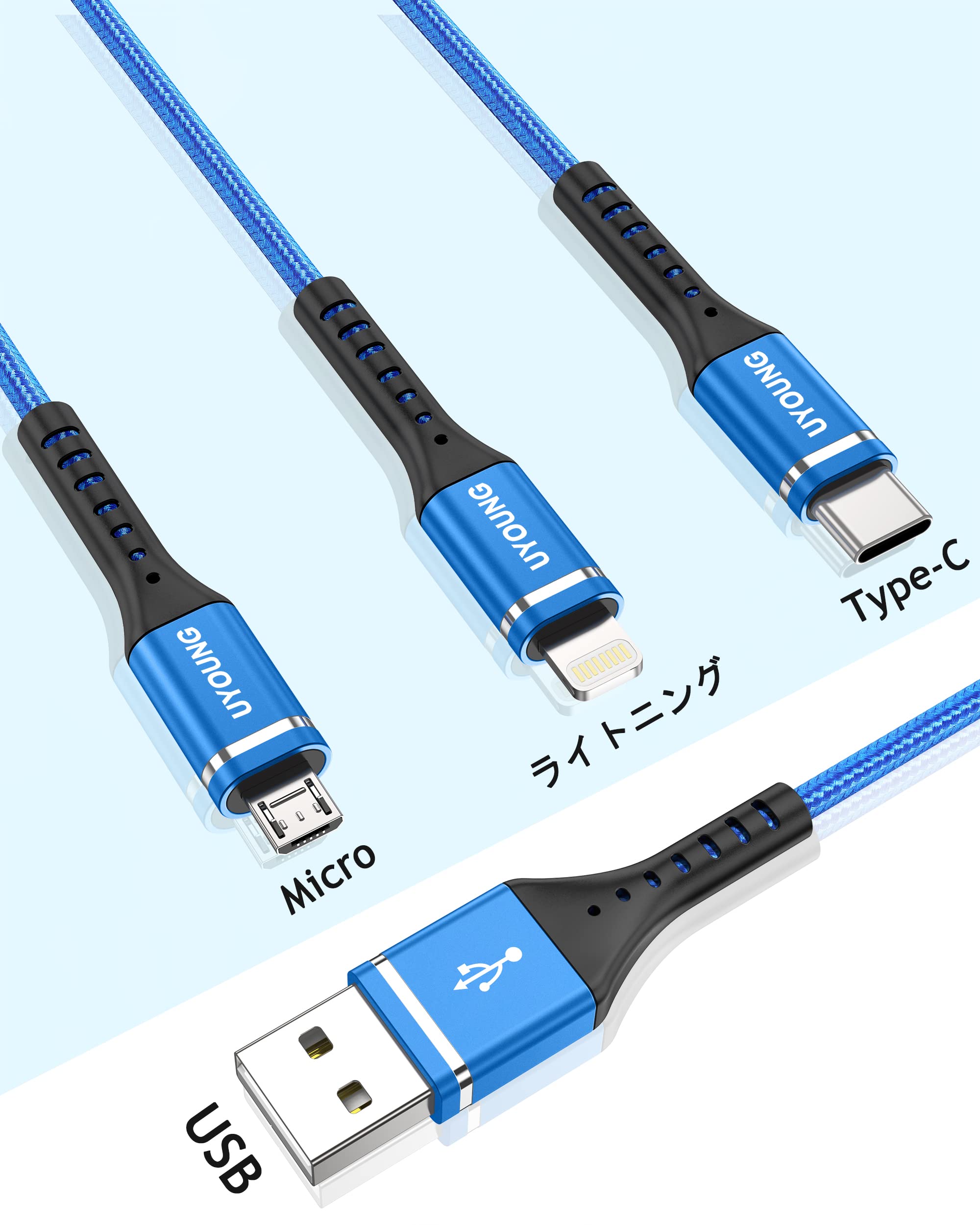 商品情報商品の説明1つのUSBポートから3台のデバイスが同時に充電できます。 もしあなたの家に異なるタイプの携帯電話があれば、多くのケーブルは必要ありません。デスク、リビング、寝室、車など、どんな場合でも使用できます。 ▼名前:UYOUNG 3in1 USB ケーブル ▼特徴:3in1 ▼素材:アルミニウム合金+ナイロン編み ▼長さ:120 cm ▼端子:Type-C、ライトニング、Micro USB 一本のケーブルで3つのデバイスを同時に充電できるし、3種類の端子(ライトニングiOS・Type-C・Micro USB)を搭載しており。市場ほとんどな機種に対応できます。 強靭なナイロン編み、高質感アルミ合金外装を採用しており、ケーブルの高い耐久性を実現しました。 ご注意 : Lightningコネクタ(iOSモデル)のみがデータ転送をサポートできます。 Type-CインターフェースとMicro USBインターフェースは充電のみをサポートし、データ転送を対応しません。主な仕様 【3in1 充電ケーブル】本製品は三合一充電線、マルチヘッド充電線です。3種類の端子(ライトニングiOS・Type-C・Micro USB)を搭載しており、自宅、オフィス、車内等色々な場所で、1本だけを持つと十分。br【3台同時充電 】1つのUSBポートから3台のデバイスが同時に充電できます。ライトニングデバイス、Type-C機器、マイクロUSB機器を対応し、3台接続機器へ同時に急速充電を対応します、充電スピードも早くて 本当に便利です。br【高耐久ナイロン&断線防止設計】柔軟性と耐久性を兼ね備えた二重編込高耐久ナイロン素材を採用、iPhone充電ケーブルがより頑丈で柔軟になります。根元強化デザイン、10000回以上の折り曲げテスト、普通のケーブルより長い使用可能です。br【対応機種・幅広い互換性】3in1 多機能ケーブルはほぼ全設備にphone対応できます。ライトニング端子・Type C端子やMicro USB端子搭載のスマホ・タブレット・イヤホン等のUSB周辺機器を対応します。br【安心サポート】購入後最大12カ月保証と無期限無料技術サポートを付いております。品質に問題が発生した場合におきましては、全額返 金、もしくは新品とお取り替え致します。