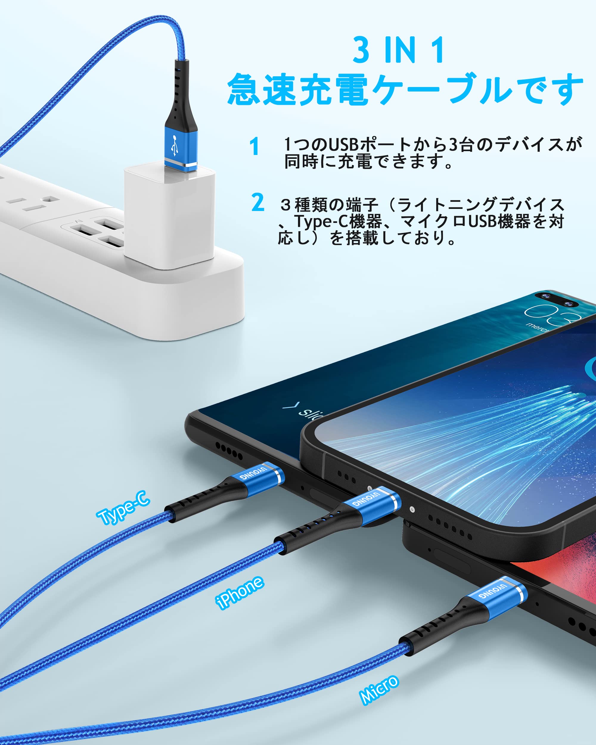 【送料無料】USBケーブル 3in1 充電コード 1.2m (ライトニング/USB-C/Micro USB端子) iPhone Android タイプC ケーブル 各種対応