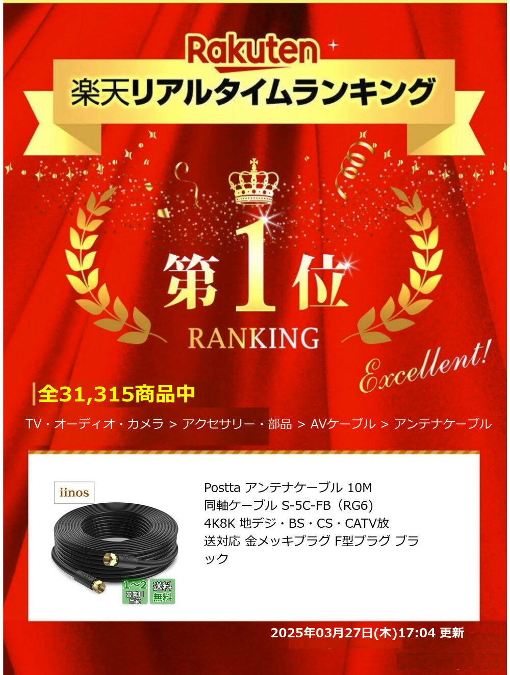【送料無料】【楽天ランキング1位獲得】Postta アンテナケーブル 10M 同軸ケーブル S-5C-FB(RG6) 4K8K 地デジ・BS・CS・CATV放送対応 金メッキプラグ F型プラグ ブラック