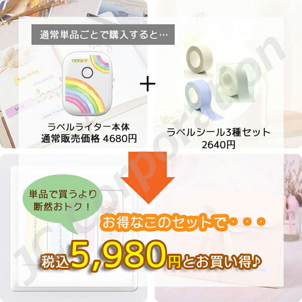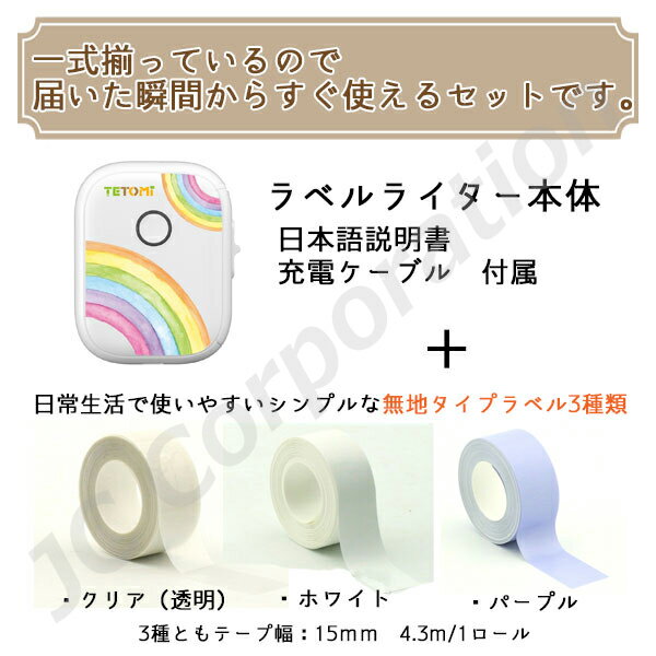 TETOMI ラベルライター + ラベルシール 3種セット スマホ対応 12~15mm幅 ラベルライター USB充電式 ラベルプリンター コンパクト 小型 連続 シール ラベル印刷 インク不要 Android iOS 感熱式 A-9 A-12