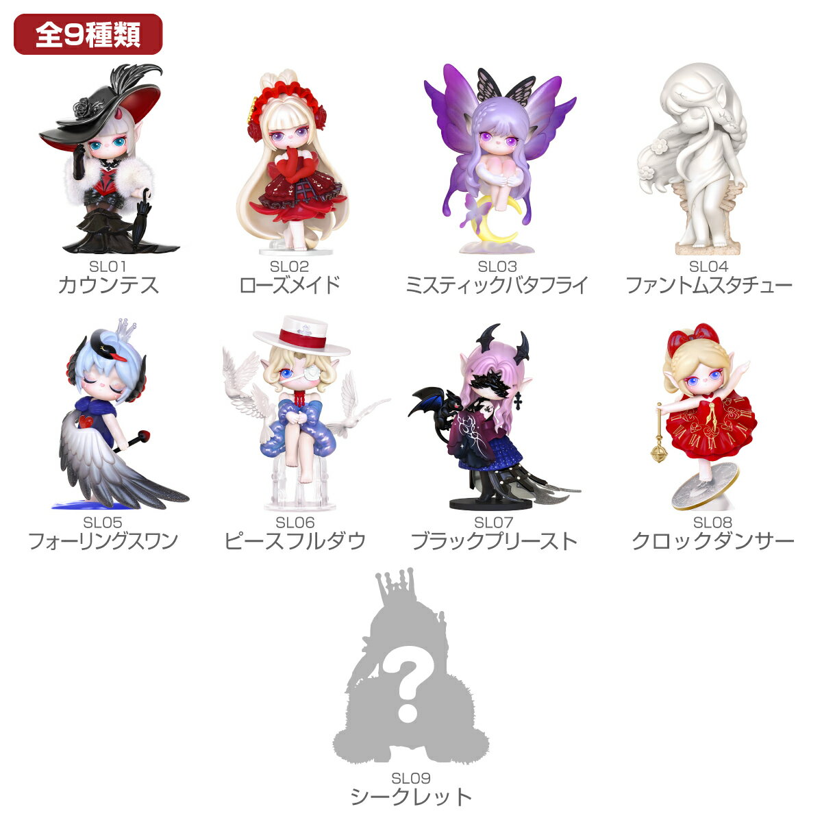 商品詳細シリーズ名:Suri 種類:ミステリーキャッスル メーカー型番:SL PKGサイズ:90x90x125mm 材質:PVC、インキ 対象年齢:15歳以上 ご注意:シークレットはランダム封入のため、必ず当たるわけではありません。 1個購入=ランダム1個発送(種類はお選びいただけません) 1BOX(8個)購入=未開封のアソートボックス(8種類重複なし)で発送 シークレット含めて、全シリーズは9種類、1アソートボックスにて8種類揃います。商品説明謎めいた黒い古城を舞台にしたシリーズ。 遊んだり、飾ったり、コレクションしたりと、子どもも大人も楽しめるアイテムです。 ギフトやプレゼントにも最適で、誕生日やイベントに喜ばれる一品です。注意事項●バラ購入の場合、8種類+シークレット1種のうち1体がランダムで梱包されています ●全て同じパッケージで密封されているため、購入時点ではどのデザインのフィギュアが入っているか分かりません。フィギュアの指定は一切できませんので、ご了承ください。 ●複数個購入して同じ内容のものが入っている場合がございますのでご了承ください。なお、その場合の返品・交換は一切お受けいたしかねます。 ●万が一、破損などがあった場合も、新品(未開封)の商品と交換となりますので違う商品が出る可能性がございます。 ●本商品を8個(BOX)単位でご購入いただいた場合、BOX入りで発送します。BOX内で同じ内容のフィギュアが入っていることはありません。 ●モニターの発色具合によって実際のものと色が異なる場合がございます。 ●本体以外の商品につきましては使用例・組み合わせ例として掲載しており付属しておりませんのでご注意ください。【カウンテス】【ローズメイド】【ミスティックバタフライ】【ファントムスタチュー】【フォーリングスワン】【ピースフルダヴ】【ブラックプリースト】【クロックダンサー】 関連商品はこちらNanci MNA カラフルチョコベア [ ナン...