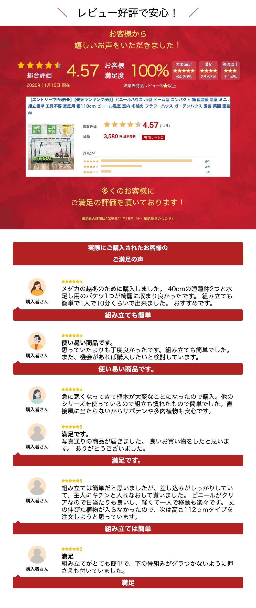 ●商品説明・組立時に道具不要!パイプを差し込むだけで簡単に組み立てができます!・ドーム型だから無駄なくコンパクト!軽いので、移動もラクラクです♪・商品本体が軽いのでラクラク移動できます!・女性の方でも簡単に組立てられます。●商品仕様・サイズ幅110cm×奥行50cm×高さ70cm・素材本体:スチール ジョイント:ポリプロピレンカバー:塩化ビニール 【ご注意】 長期間保管される際には、ビニールカバー同士がくっつき破れる恐れがありますので、片栗粉をまぶして保管してください。 当製品は霜や風除けを目的としており、内部の温度を保つものではありません。 風の強い日は転倒して破損する恐れがありますので、温室内の物を風の当たらないところに移し、温室のビニールカバーは取り外してください。 ジョイント、枠組みパイプ、ビニールカバーは耐久性に配慮した仕上げになっておりますが、長年の使用では劣化や強度の低下による破損のおそれも生じます。定期的にご確認の上、適宜交換することをおすすめします。 本製品は冬季の簡易温室仕様になっております。夏季はビニールカバーやジョイント等の劣化が進みやすくなりますのでご使用をお避け下さい。関連商品【楽天ランキング1位!】ビニールハウス コンパクト ドーム型 簡易温室...ビニールハウス コンパクト ドーム型 簡易温室 温室 ミニ 小型 組立...【楽天ランキング1位獲得!】 花支柱 植物支柱 10本セット 花支え ...2,980円2,180円2,480円ビニールハウス 簡易温室 温室 段なし ミニ 小型 組立簡単 工具不要...ビニールハウス コンパクト 簡易温室 温室 2段式 ミニ 小型 組立簡...GK7200用替えシート ビニールハウス ドーム型 簡易温室 温室 ミ...3,680円3,980円1,680円グリーンキーパー用替えカバー 2段用 ビニールハウス 簡易温室 温室 ...セミグリーンジャンボ用替えシート ビニールハウス ドーム型 簡易温室 ...グリーンキーパー用替えカバー 4段用 ビニールハウス 簡易温室 温室 ...2,280円4,980円1,680円グリーンキーパー用替えカバー 3段用 ビニールハウス 簡易温室 温室 ...ビニールハウス コンパクト 簡易温室 温室 3段式 ミニ 小型 組立簡...グリーンキーパーコンパクト用替えカバー ビニールハウス 簡易温室 温室...1,850円4,680円1,250円▼ 誰でも簡単組立!家庭用温室はこちら ▼ 幅97cm奥行71cm高さ112cm 幅69cm奥行49cm高さ90cm 幅69cm奥行49cm高さ125cm 幅69cm奥行49cm高さ155cm 幅65cm奥行40cm高さ55cm 幅70cm奥行50cm高さ70cm 幅110cm奥行50cm高さ70cm 幅140cm奥行50cm高さ70cm ▼ 誰でも簡単組立!家庭用大型温室はこちら ▼ 幅140cm奥行73cm高さ195cm 幅122cm奥行186cm高さ190cm 幅150cm奥行220cm高さ216cm 幅100cm奥行71cm高さ155cm