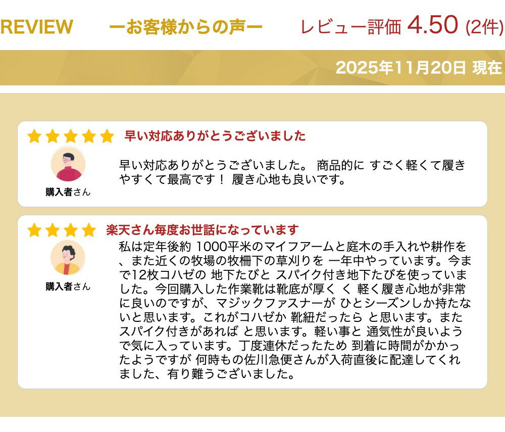 水をはじく新しいらく足袋登場! 撥水加工をしている為、朝露などで表面の濡れを軽減します。 [特長] 〇包み込まれているような安心感 ハンシンスーパークッションインソールを搭載し、畑仕事の足元をしっかりサポート。マジックテープで脛まで固定するからホールド感とクッション性が抜群! ラバー底&先丸で作物や補強素材を傷つけにくく、機能性を兼ね備えた、全く新しいらく足袋です。 〇男女兼用のSS〜3Lでだれでも使える! サイズ豊富なバリエーションだからチームや家族でも使えます!ガーデニング、 ワーク、 農業などさまざなシーンで活躍します。 〇撥水加工で汚れにくさUP! 農作業でなにかと汚れやすい靴をきれいにキープ!デザインもおしゃれでコーディネートがばっちり決まるので作業中の気分もあがります。 [商品名] らく足袋撥水モデル(先丸) [カラーバリエーション] ブラック / ネイビー [商品仕様] ブランド名:フーソレイユ 素材:アッパー:綿 ソール:EVA+合成ゴム サイズ:SS(23.0-23.5)/ S(24.0-24.5)/ M(25.0-25.5)/ L(26.0-26.5)/ LL(27.0-27.5)/ 3L(28.0-28.5) 検索キーワード 畑作業 野良仕事 林業 収穫祭 デザイン カジュアル イベント 企画 体験 ユニフォーム 作業着 作業靴 畑仕事 庭仕事 庭師 男性 女性 菜園 ファーム スタイル コーデ 果樹園 牧場 花壇 温室 植物園 野菜 果物 フルーツ 苗 手入れ 朝採り 田畑 葉物野菜 プランター 温室野菜 ハウス農園 農園 山 田園 プレゼント ギフト 他のシリーズはこちら らく足袋撥水モデル らく足袋プラス らく足袋プラス京の農林女子モデル らく足袋プラスファスナー