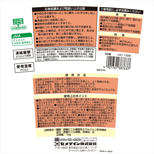 【商品情報】●かべパテの業務用サイズです。●扱いやすく、密閉度の高いプラスチックペール缶入り。●安心して使える水性パテです。●壁紙貼りの下地調整、釘穴・ふし穴などの補修に適しています。●硬化後は塗装もできます。●垂直面でもダレにくく(固体のため)、のびがよい。【商品仕様】●容量:1kg●主成分:酢酸ビニル樹脂●個装サイズ:125×Φ130(mm)●個装重量:1110g【注意事項】●火気のあるところでは使用しない。●使用時及び使用後しばらくは換気をよくする。●子供の手の届かないところに置き、いたずらをしないよう注意する。●用途以外に使用しない。●衣服につくととれないので注意する。●直射日光の当たらない涼しい場所に保管する。●中身を使い切ってから自治体の定める方法により燃えないゴミとして捨てる。●皮ふについた場合はすぐにふき取り、石けんでよく洗い流してください。●使用時に気分が悪くなるなどの異常を感じた場合は、すぐに空気の新鮮な場所に移動し、必要に応じて医師の診察を受けてください。●目に入った場合はこすらずに多量の水で洗眼し直ちに医師の診察を受けてください。●飲み込んだ場合は、すぐに口の中を洗い、直ちに医師の診察を受けてください。●かゆみや炎症などの症状が出た場合は、すぐに使用をやめ医師の診察を受けてください。【使用方法】(1)袋を開ける前に、よくもんで、中身を均一にします。(2)補修部分の汚れ、ゴミなどをよく取り除きます。(3)ヘラを押しつけるように塗りつけます。(4)充分に乾燥してからサンドペーパーをかけ表面を平らにします。※深い穴や凹みを補修する場合は、一度に厚く塗ると割れや肉やせの原因となりますので2〜3回に分けて乾燥してから塗り重ねてください。※色を塗る場合は、乾いてから水性塗料などで行ってください。※塗りつけた厚みにもよりますが、約4時間で乾きます。※使用後は輪ゴムなどで袋を密封してください。※壁紙・壁クロスの貼り付けは完全に乾燥してから行ってください。[キーワード]セメダイン かべパテ 1kg 箱 HC-158 接着剤 家庭用 業務用 プロ用 多用途 瞬間 手芸 工作 コーキング材 シーリング材 建築 工業 内装 外装 防水 壁紙 パテ ひび割れ 補修 日曜大工 DIY リフォーム業 設備 学校 施設 布用 接着剤 家庭用 業務用 プロ用 多用途 瞬間 手芸 工作 コーキング材 シーリング材 建築 工業 内装 外装 防水 壁紙 パテ ひび割れ 補修 日曜大工 DIY リフォーム業 設備 学校 施設 プラスチック用 布用