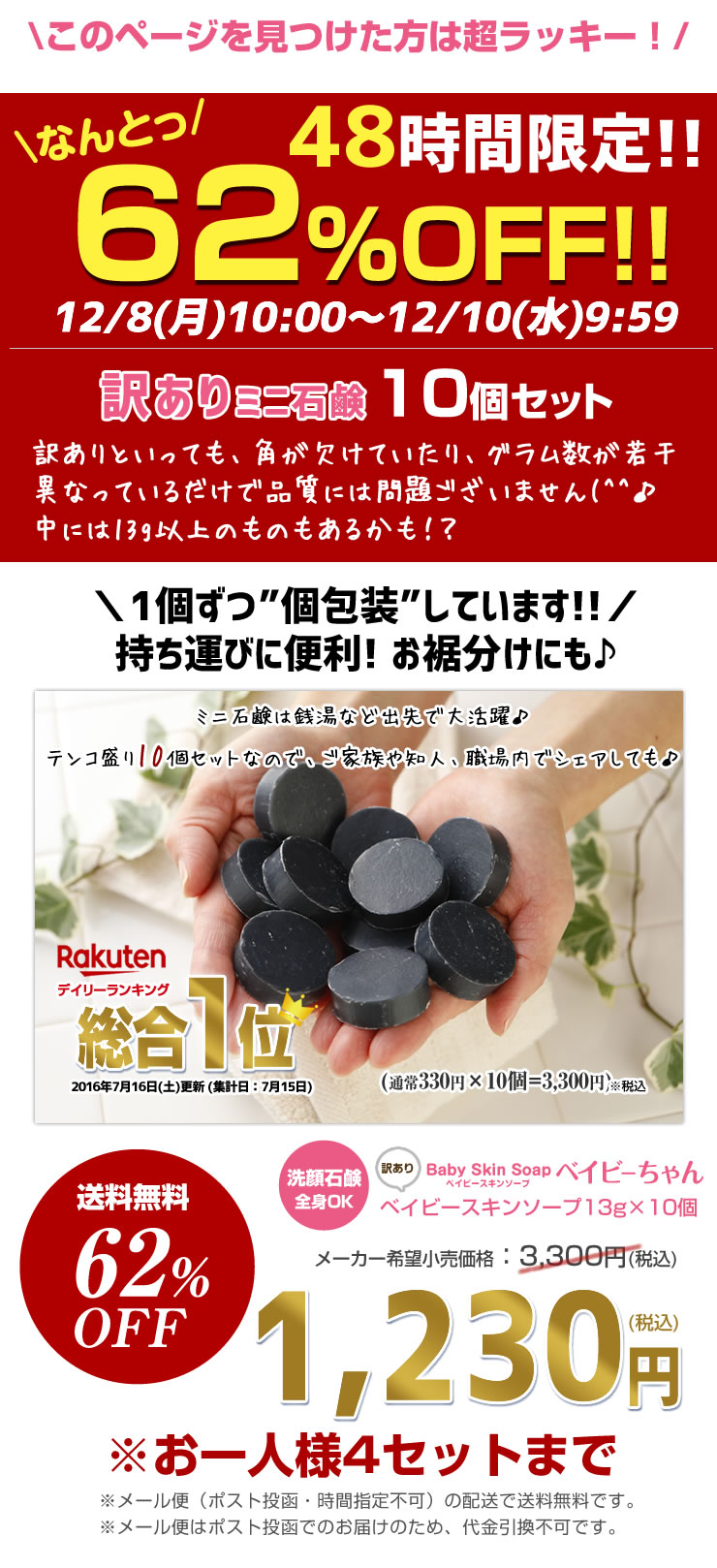 \62%OFF/12/8(月)10:00~【48時間限定】★訳ありミニ石鹸10個セット★3,300円⇒1,230円送料無料♪【400万個突破!!総合1位獲得☆訳ありベイビーちゃんミニ石鹸テンコ盛り130g】ベイビースキンソープ ボディーソープ 加齢臭 敏感肌 洗顔 毛穴 黒ずみ イチゴ鼻【メール便】