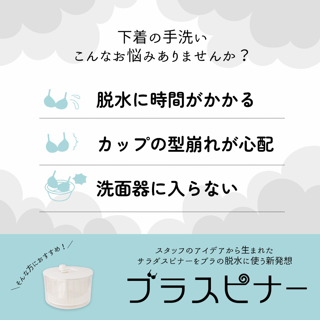 ※お使いのモニター、スマートフォンにより、実際の商品と色味が異なって見える場合がございます。 商品説明 スタッフのアイデアから生まれた サラダスピナーをブラの脱水に使う新発想『ブラスピナー』! 【ブラスピナーのポイント】 1.脱水を早く、楽しく タオルドライにかかる手間や時間を短縮! 2.型崩れしにくい ブラの機能を落とさず、長持ち◎ 3.M90まで入る大容量 大きいサイズの方も安心! 小物やぬいぐるみ、ベビー用品などにも◎ 電気を使わないので、災害時や停電時の洗濯にも活用できます! 「手洗いでブラを洗濯しても、結局脱水で洗濯機を使っている」という方にもぴったり! 洗濯機でブラジャーのボーンが曲がってしまう、という心配も解消されます◎ 品質表示(本体) 原料:樹脂/スチロール樹脂/ポリプロピレン 耐熱温度:70度 耐冷温度:0度 品質表示(バスケット・蓋・取っ手) 原料:ポリプロピレン/ステンレス(取っ手押さえネジ) 耐熱温度:90度 耐冷温度:0度 ご使用上のご注意 警告 ・ハンドルを回し始める際はゆっくりと回し始めてください。 ・回転を止める際はハンドルを押さえて止めないでください。 (自然に回転が止まるまで待ってください。) ※急激なスタート・ストップはギアの破損につながります。 注意 ・火のそばに置かないでください。耐熱温度以上の熱が加わりますと変形や溶ける原因になります。 ・回転軸を折らないでください。回転しなくなります。また手を刺さないように注意してください。 ・必要以上に回転を早くしたり、回転の途中で無理に回転を止めないでください。 ・回転の最中は危険ですので蓋を開けないでください。 ・蓋を押さえながら回転させてください。 ・食器洗い機や食器乾燥機では使用しないでください。変形・破損の原因になります。 ・たわし又は、みがき粉でみがくときずがつくことがあります。 ・レモン等柑橘類の皮に含まれるテルペン又は油脂により変質することがあります。 ・使用後は、よく洗い乾いた布などで水分を拭き取ってから保管してください。 ※ブラの脱水以外の目的での使用は自己責任となります。 対応サイズ ブラサイズでM90まで大きいサイズは谷間の部分でカップを半分に折りたたむと入ります。脱水は短時間のためカップの折りたたみは問題ありません。 サイズ 桶容量:6.6L平置き寸法:26cm×22.5cm 生産国 日本 発売元 株式会社HEAVEN Japan大阪府河内長野市木戸1-6-40お問い合わせ先:050-5527-8721 こちらの商品は返品交換不可となります。 置き場所に困らない脱水アイテムはこちら 関連アイテムはこちら